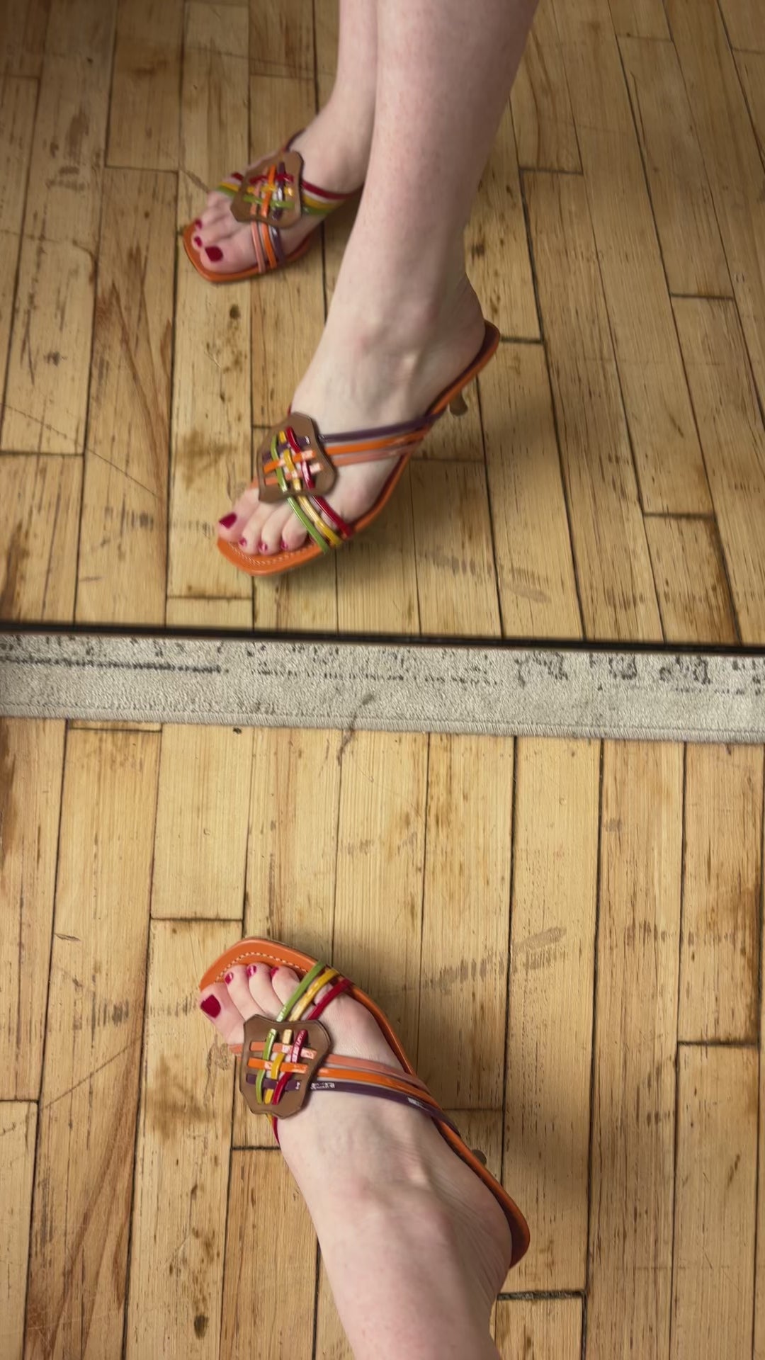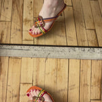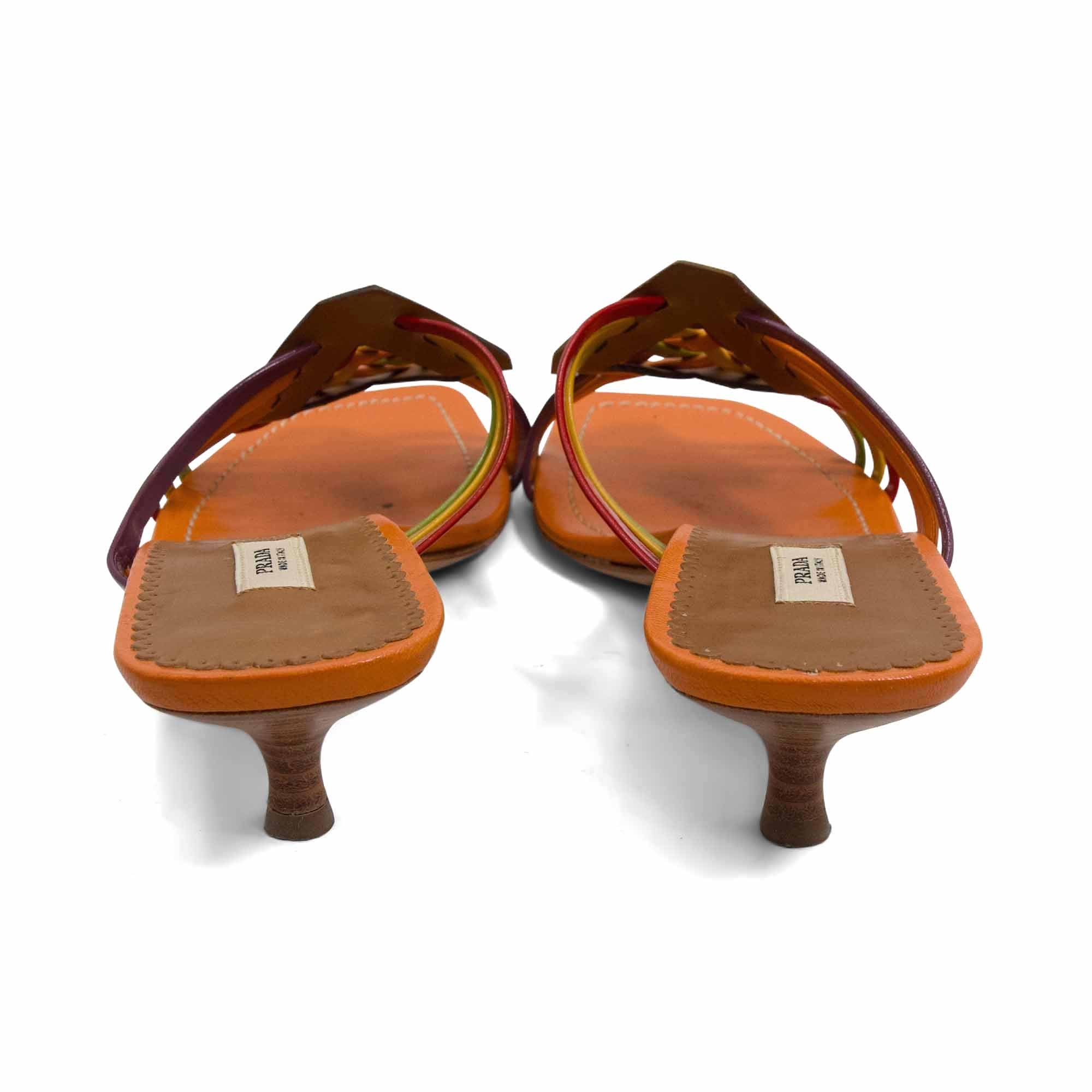 Prada open-toed mules in orange leather with multi-color woven straps in patent leather and brown leather diamond panel that connect the straps. Features a wooden stacked kitten heel.