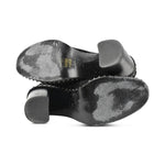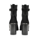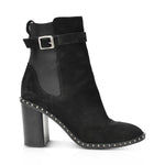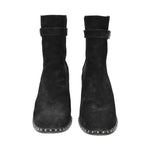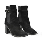 Rag & Bone black suede ankle boots with a rounded,elastic gusset sides with a buckle detail in gunmetal hardware. Features a black stacked heel.