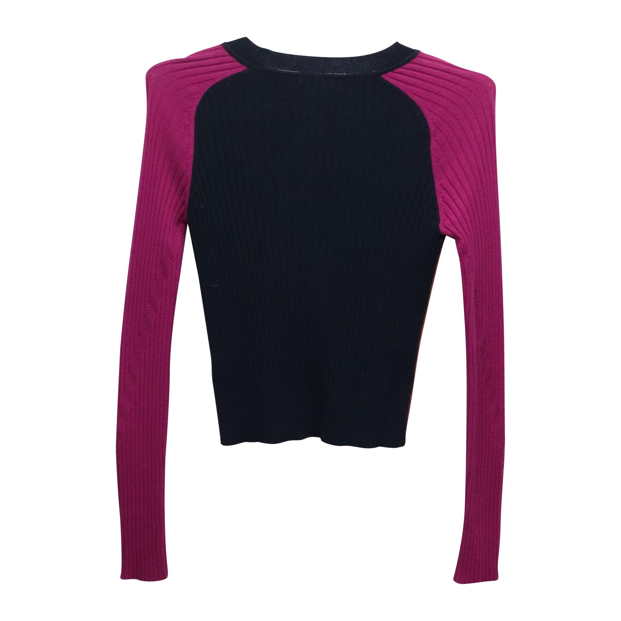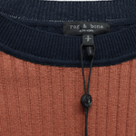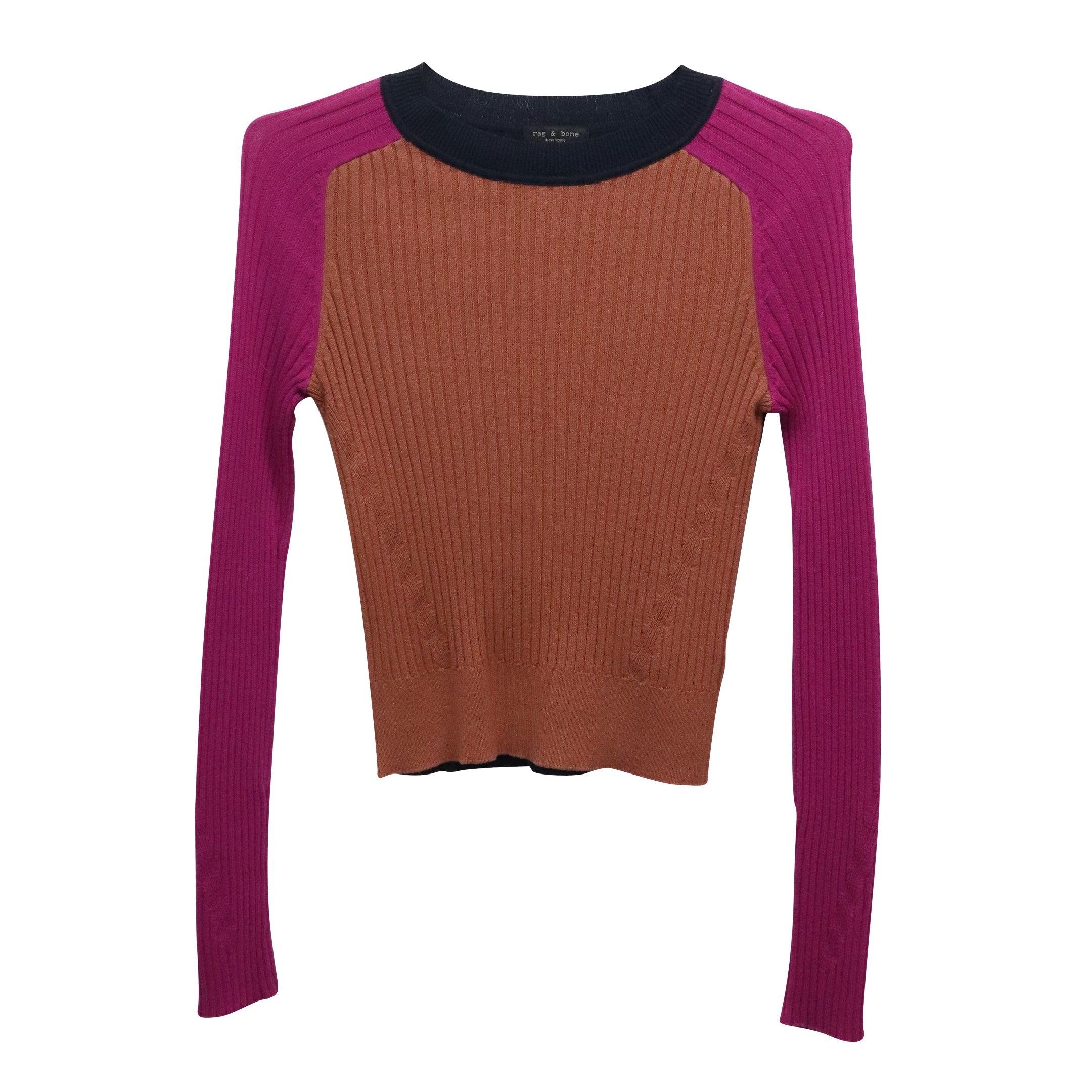 Rag & Bone ribbed crewneck sweater in magenta, light brown and navy blue colour block pattern.