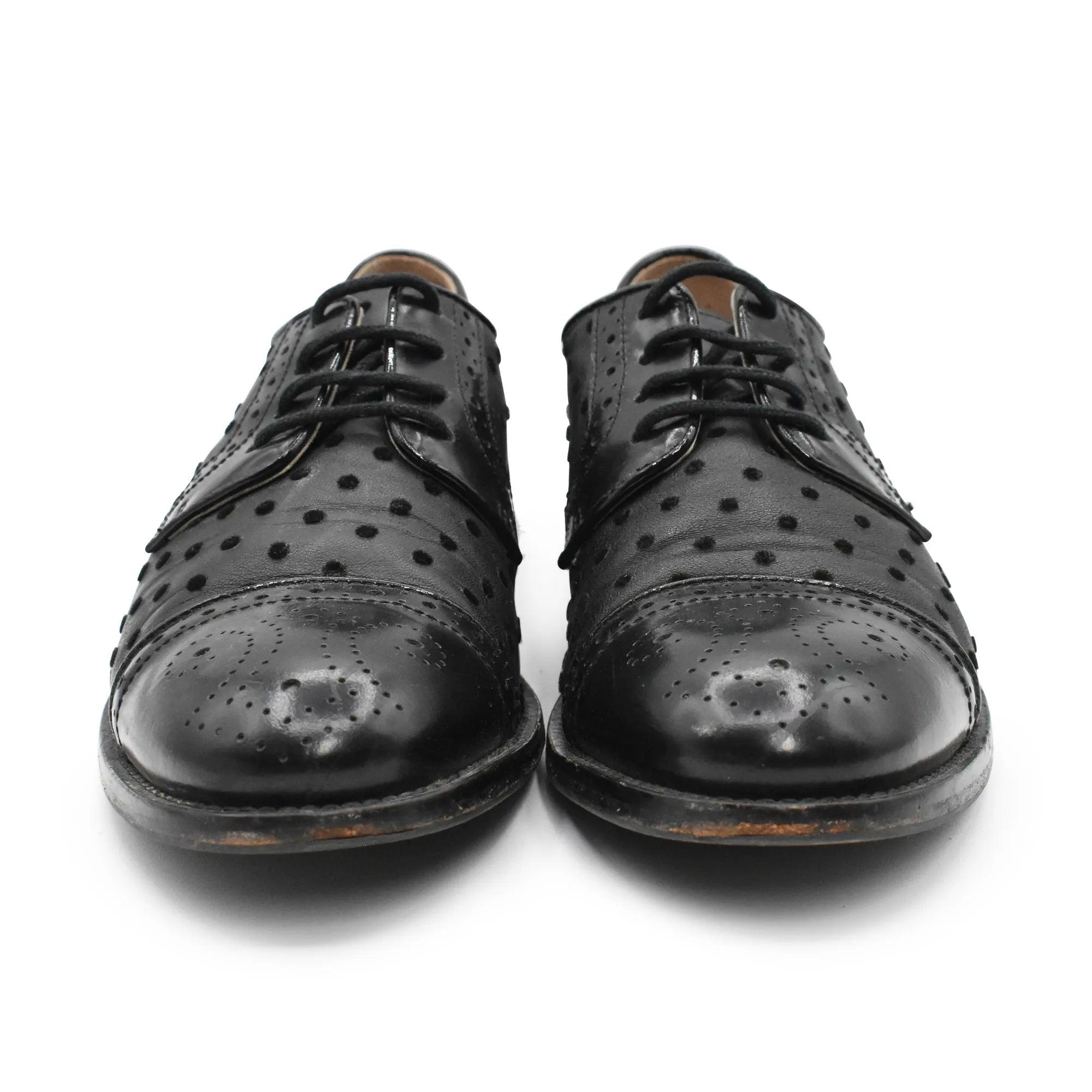 Red Valentino lace-up dress shoes in black leather with baroque leather detailing, and black velvet polka dots throughout.