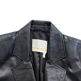 Remain Birger Christensen double breasted blazer jacket in black leather with large logo embossed buttons, a notch lapel collar, and large front pockets.