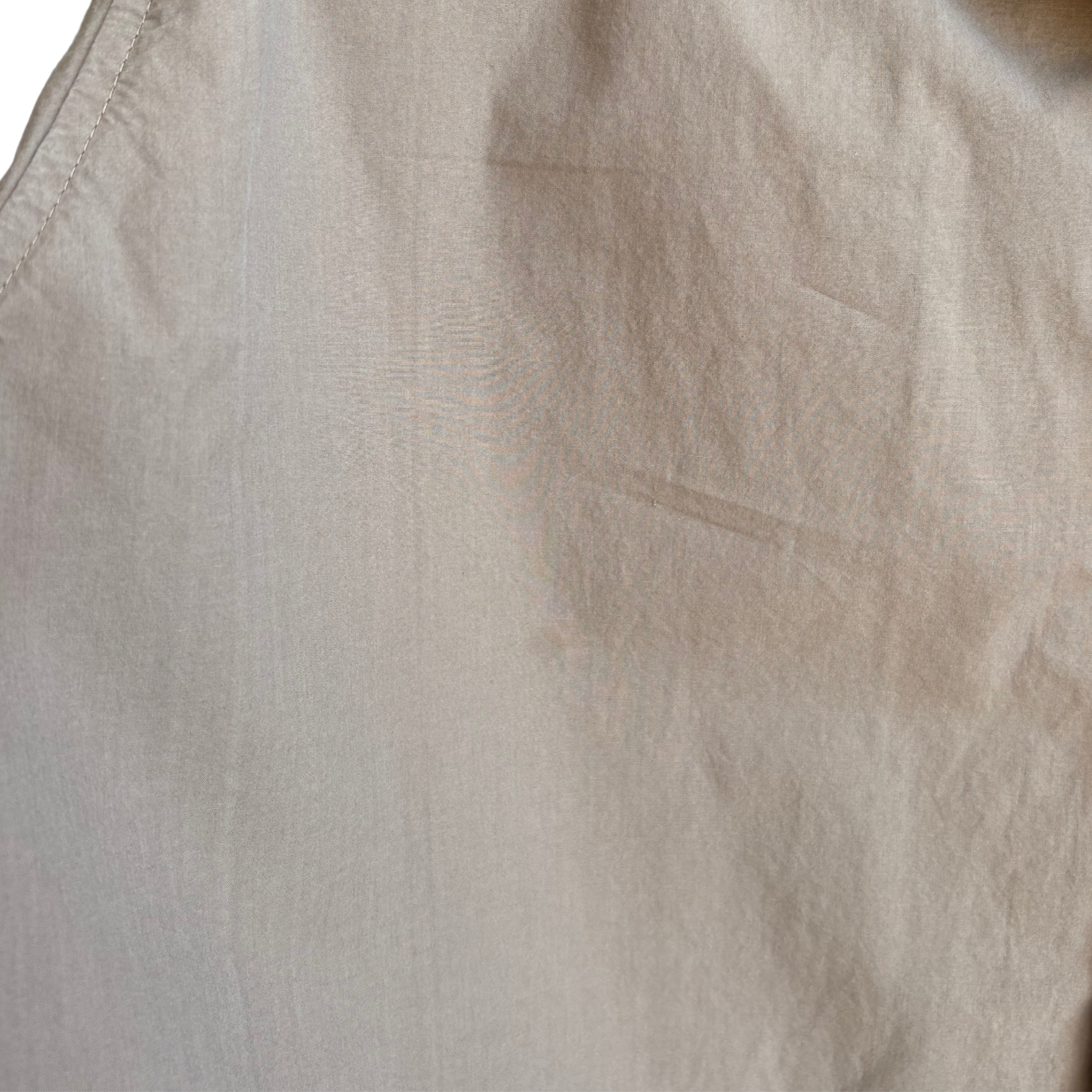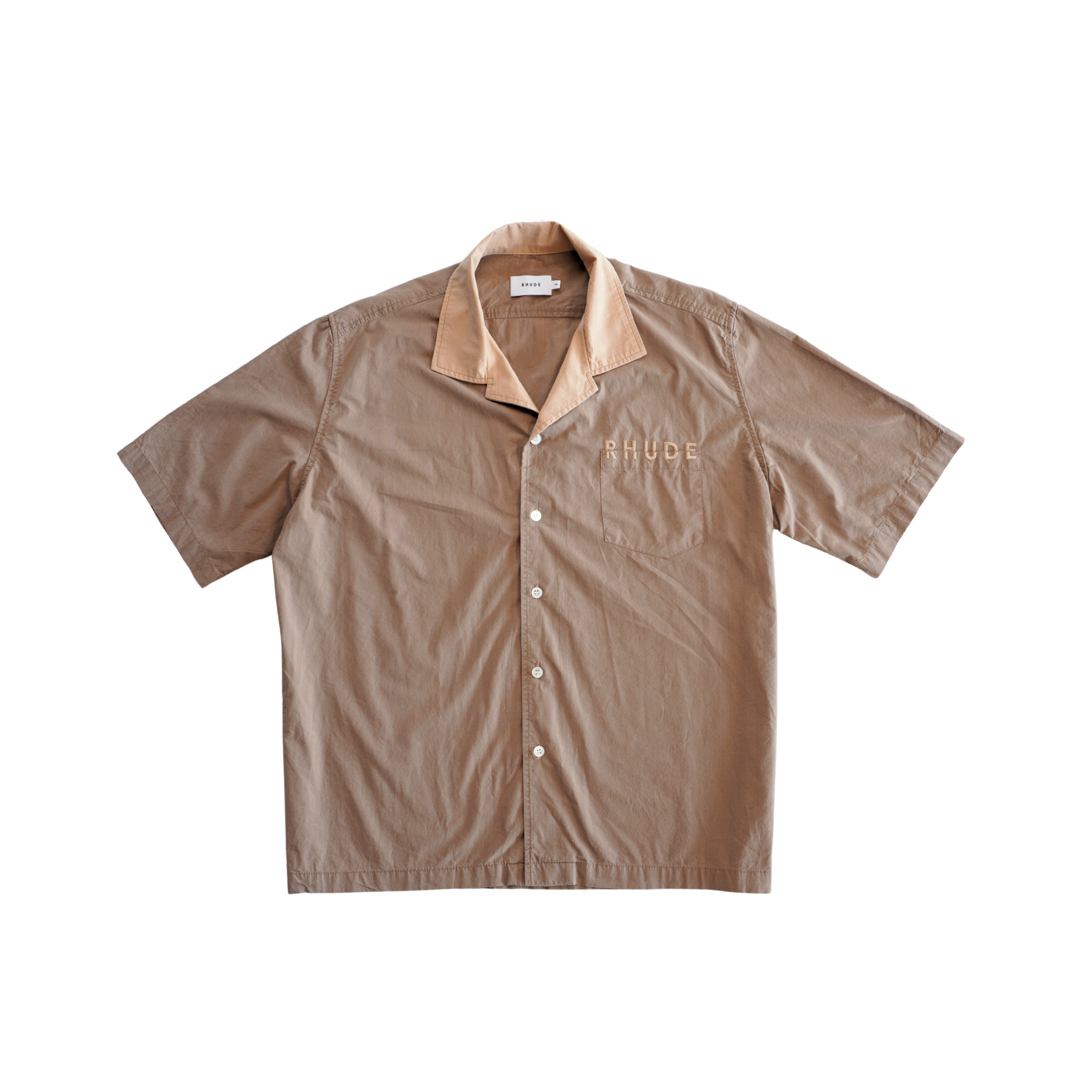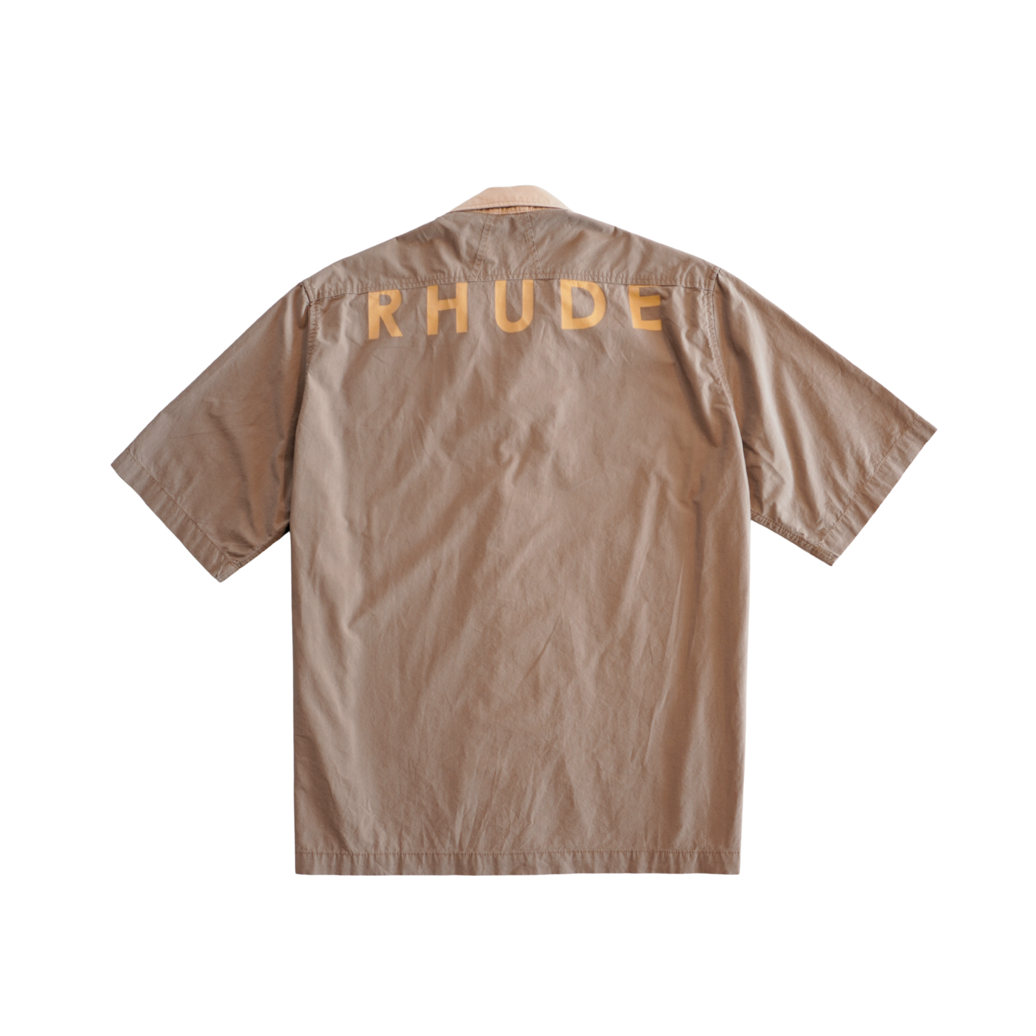 Rhude short-sleeve button-down in beige with tonal lapel collar, front patch pocket and embroidered logo on chest. Features a large beige logo text across the back.