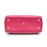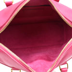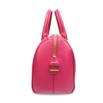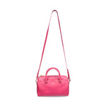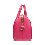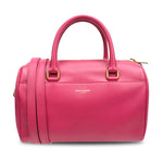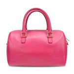 Saint Laurent 'Baby Duffle' bag in smooth hot pink leather with gold logo stamping and hardware. Features a two-way zipper and hot pink suede lining with one leather slip pocket. In addition to structured top handles, the bag has a removable crossbody strap.
