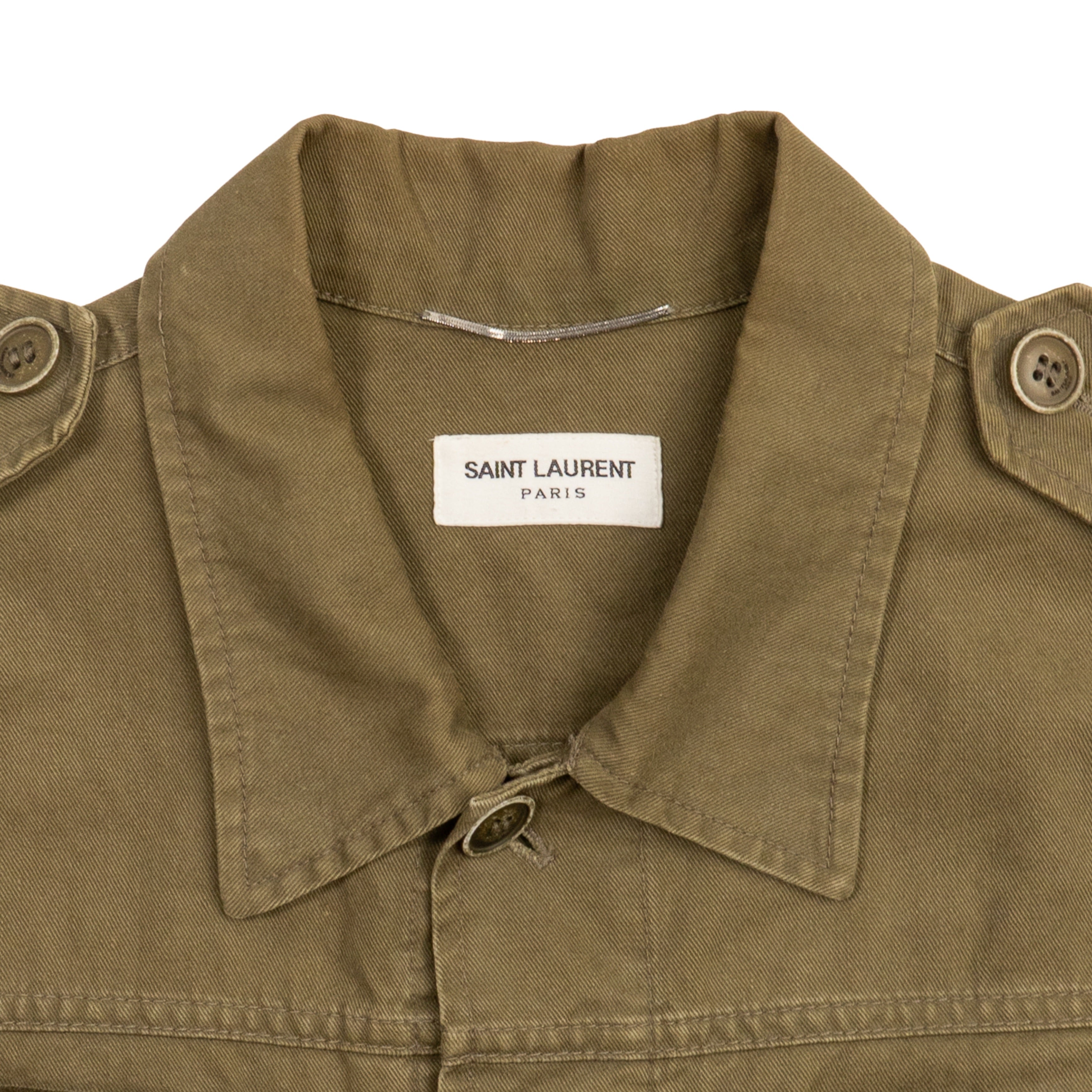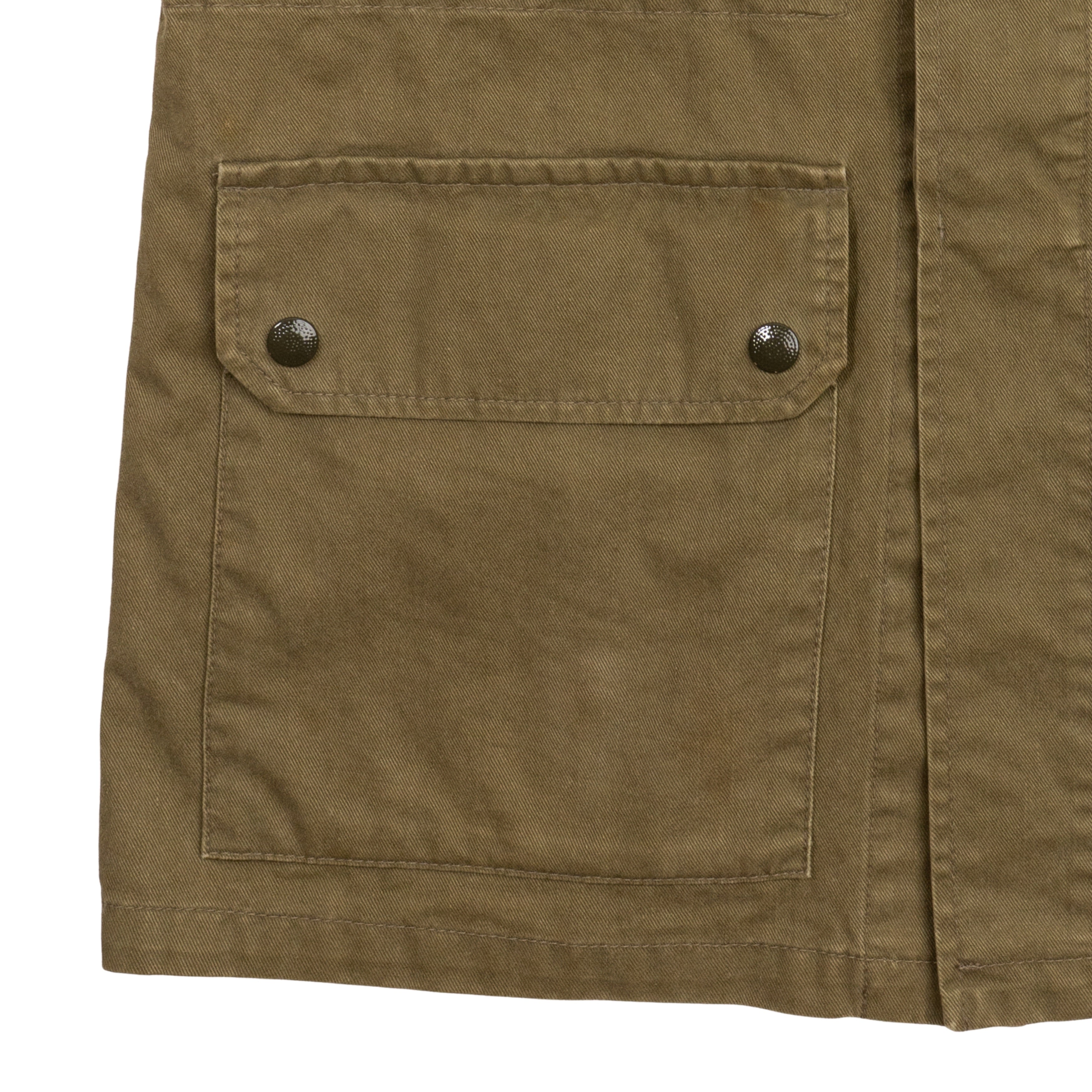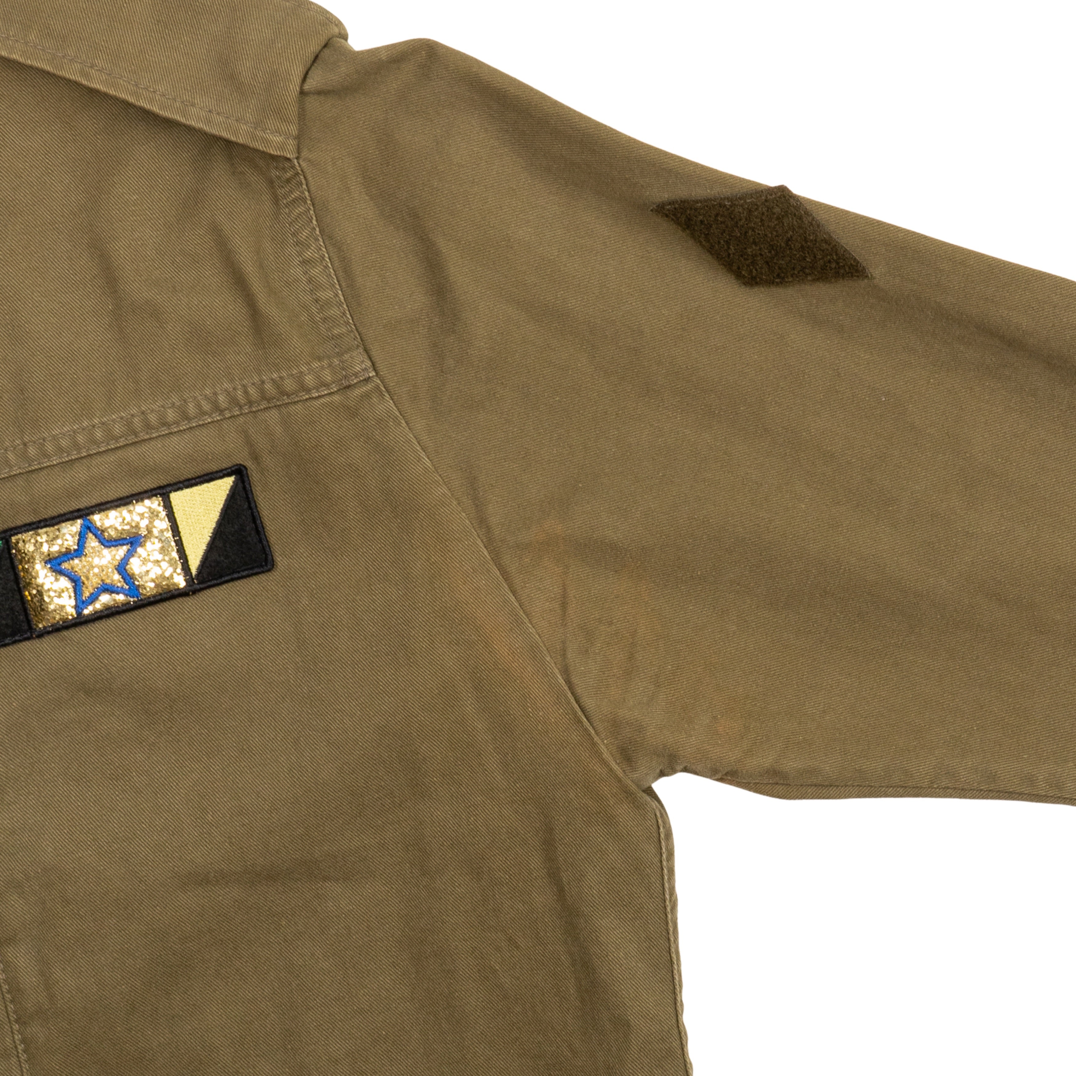 As is. Significant wear on buttons, light fading on canvas. Missing velcro patches throughout jacket.