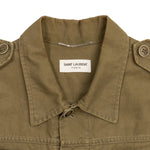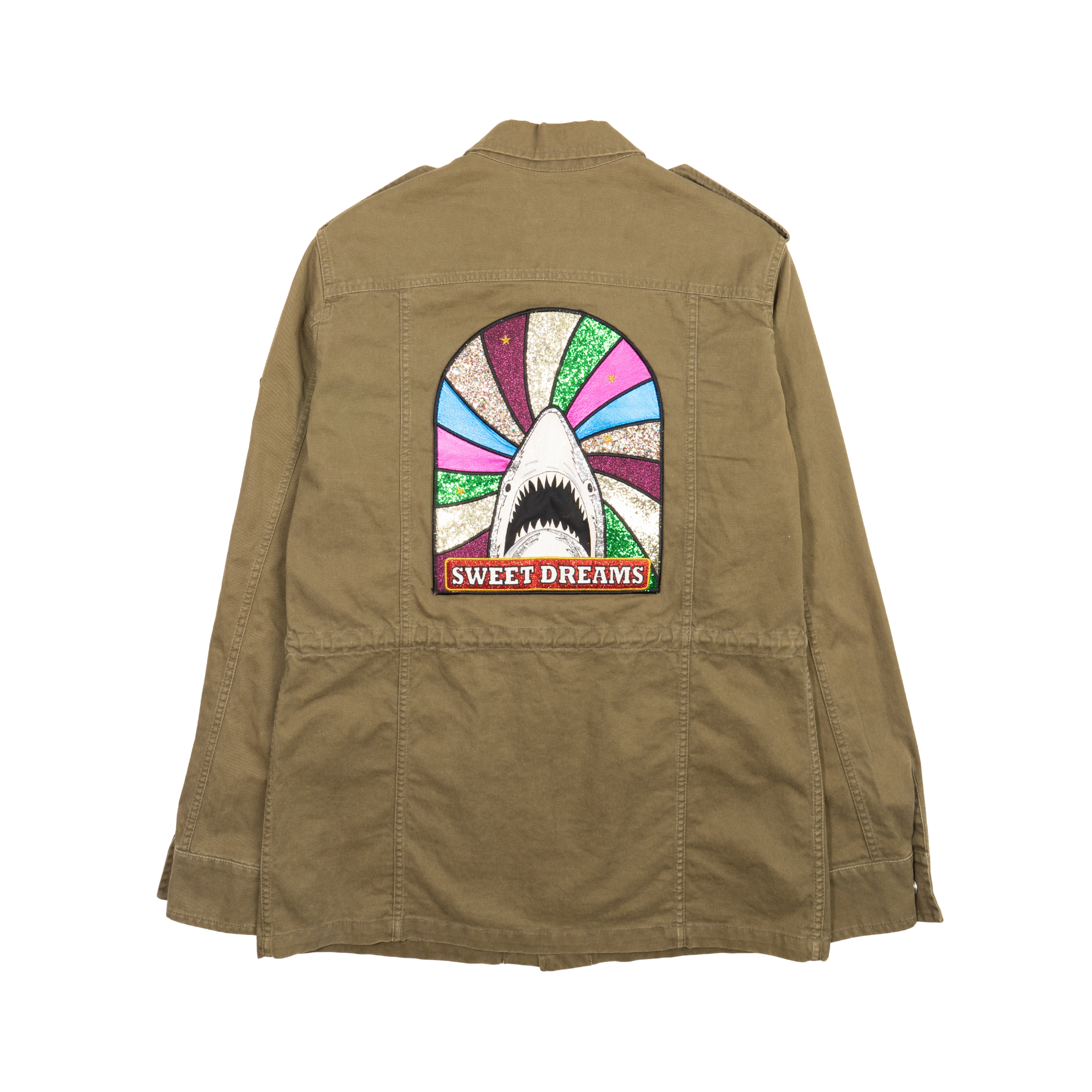 Saint Laurent 'Sweet Dreams' cargo jacket with sequin 'sweet dreams' shark patch on the back. Features sequin star patch on the chest, flap and zip pockets on the front, an adjustable tie at the waist, and a spread collar.