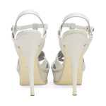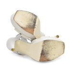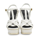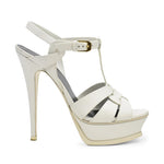 Saint Laurent 'Tribute' platform heels in white leather with a T strap and gold buckle hardware.