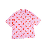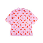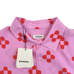 Sandro button-down shirt in light pink viscose with an all-over red four-point flower pattern, a collar neckline, and pink shell buttons.