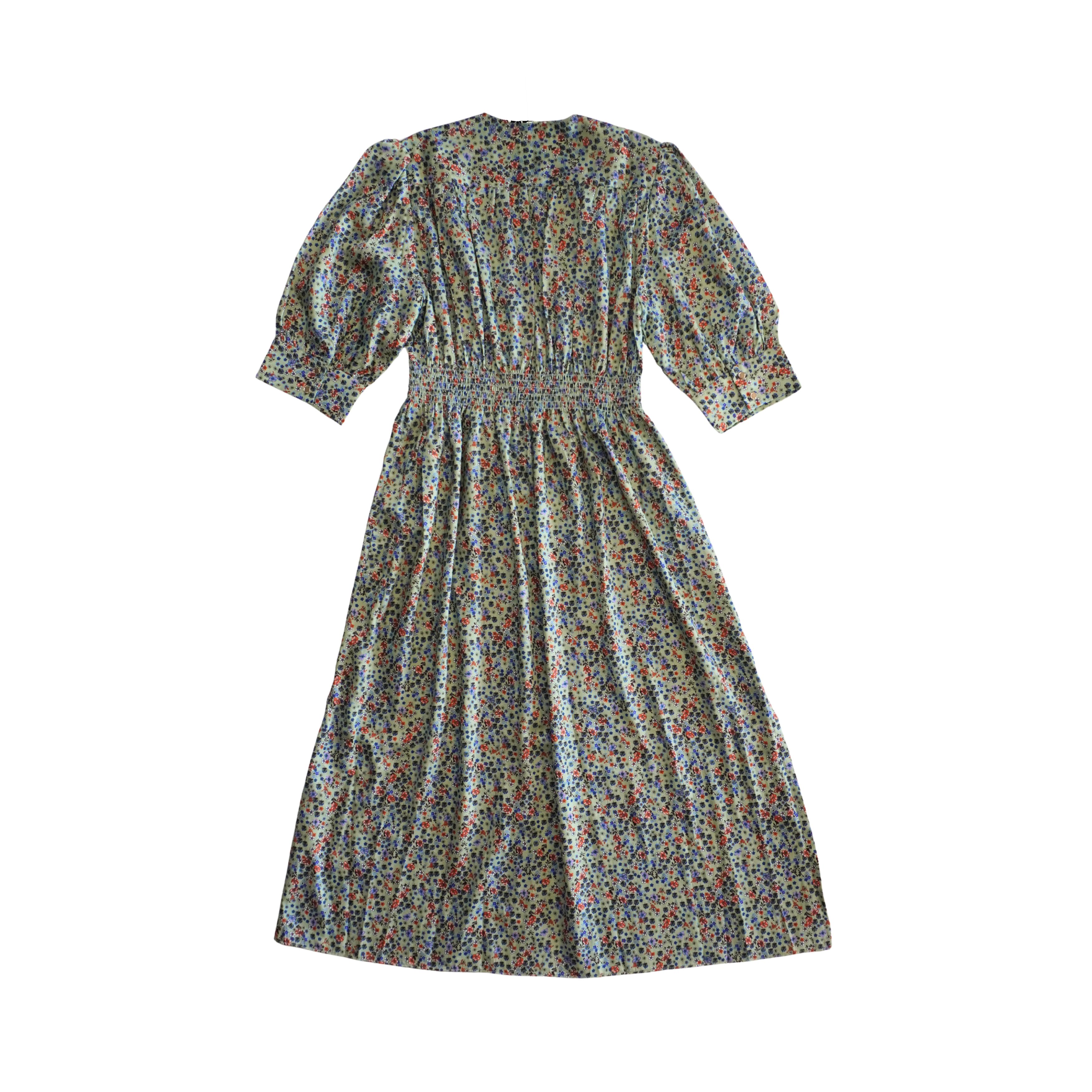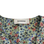 Sandro maxi dress in green, blue and orange floral pattern with v-neckline, puffed short sleeves and ruching under the bust. Featuring button-down closure in gold hardware and side slits.