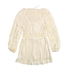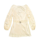 Shona Joy 'La Lune' shift dress in cream with ballon sleeves and elasticated belt with gold buckle hardware.