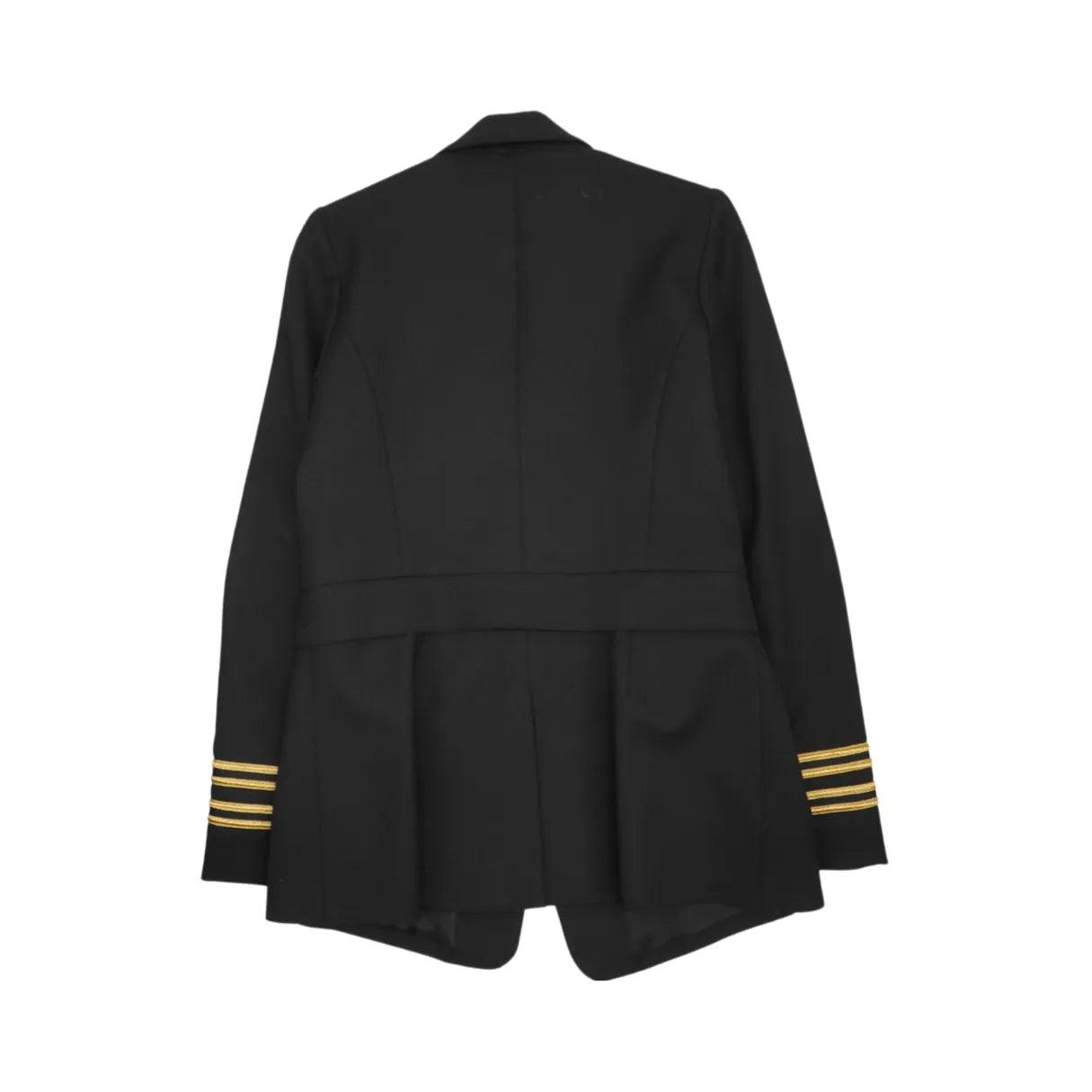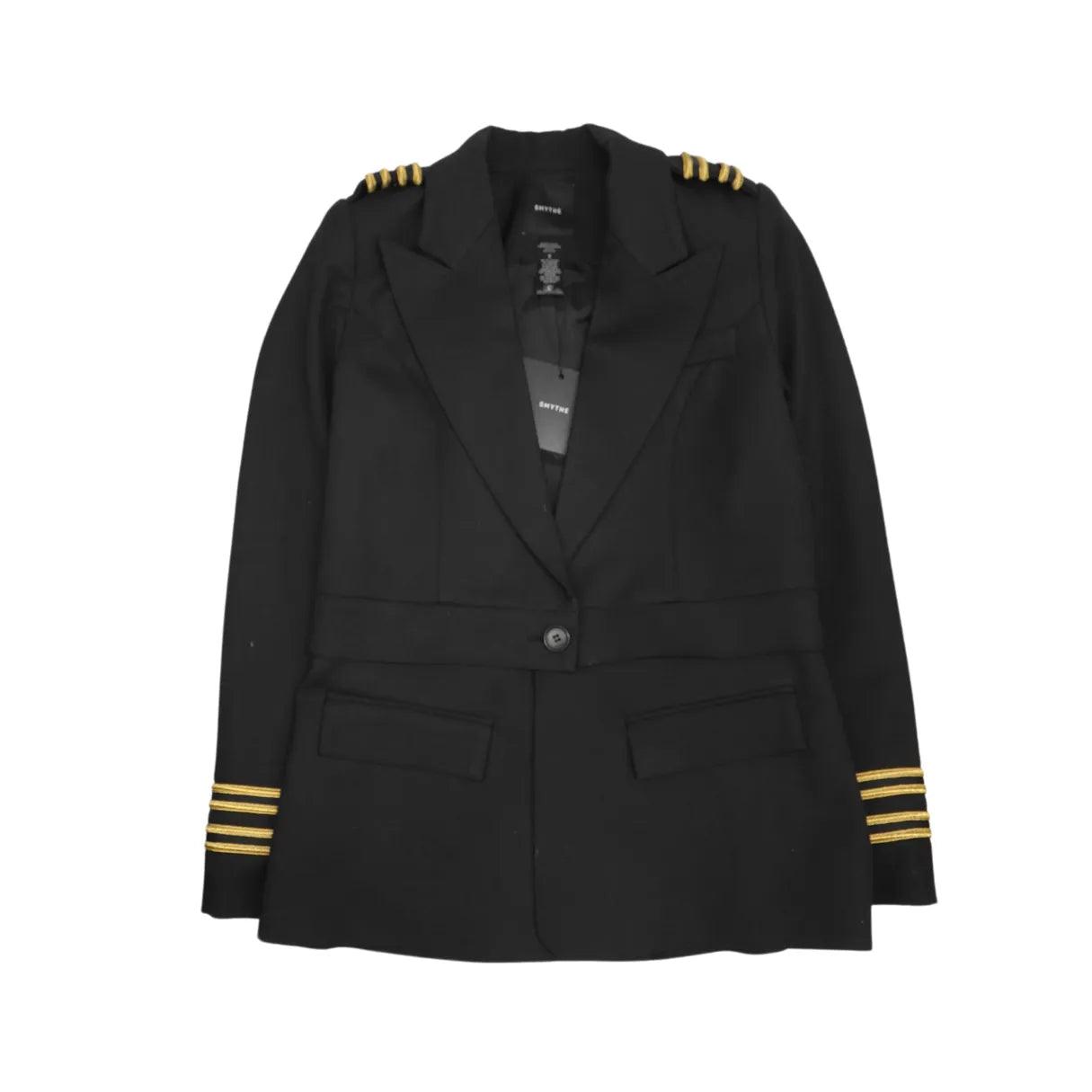 Smythe 'Two For One Military' tailored blazer in black knit with a peak lapel collar, one button closure and a metallic military trim on the padded shoulders. Features a removable bottom panel for a cropped silhouette.