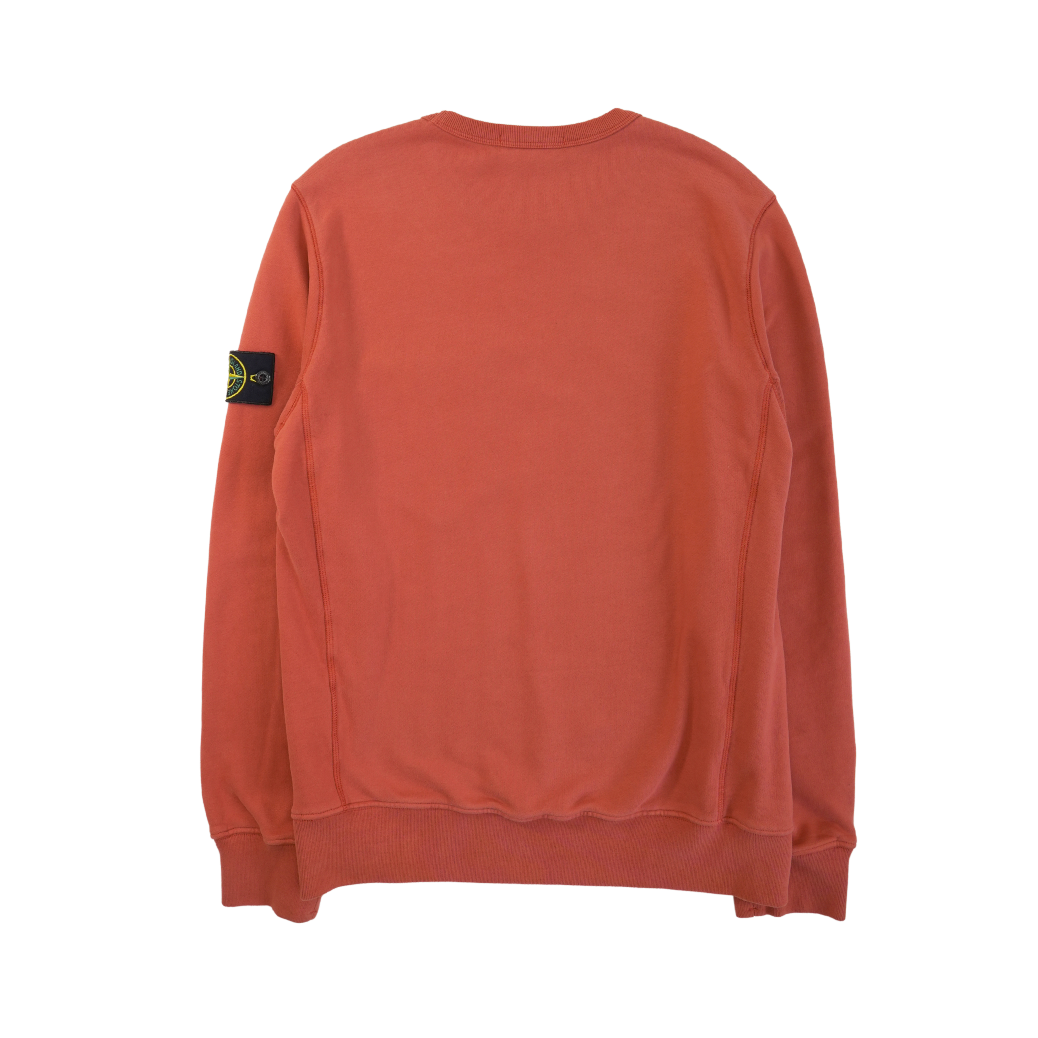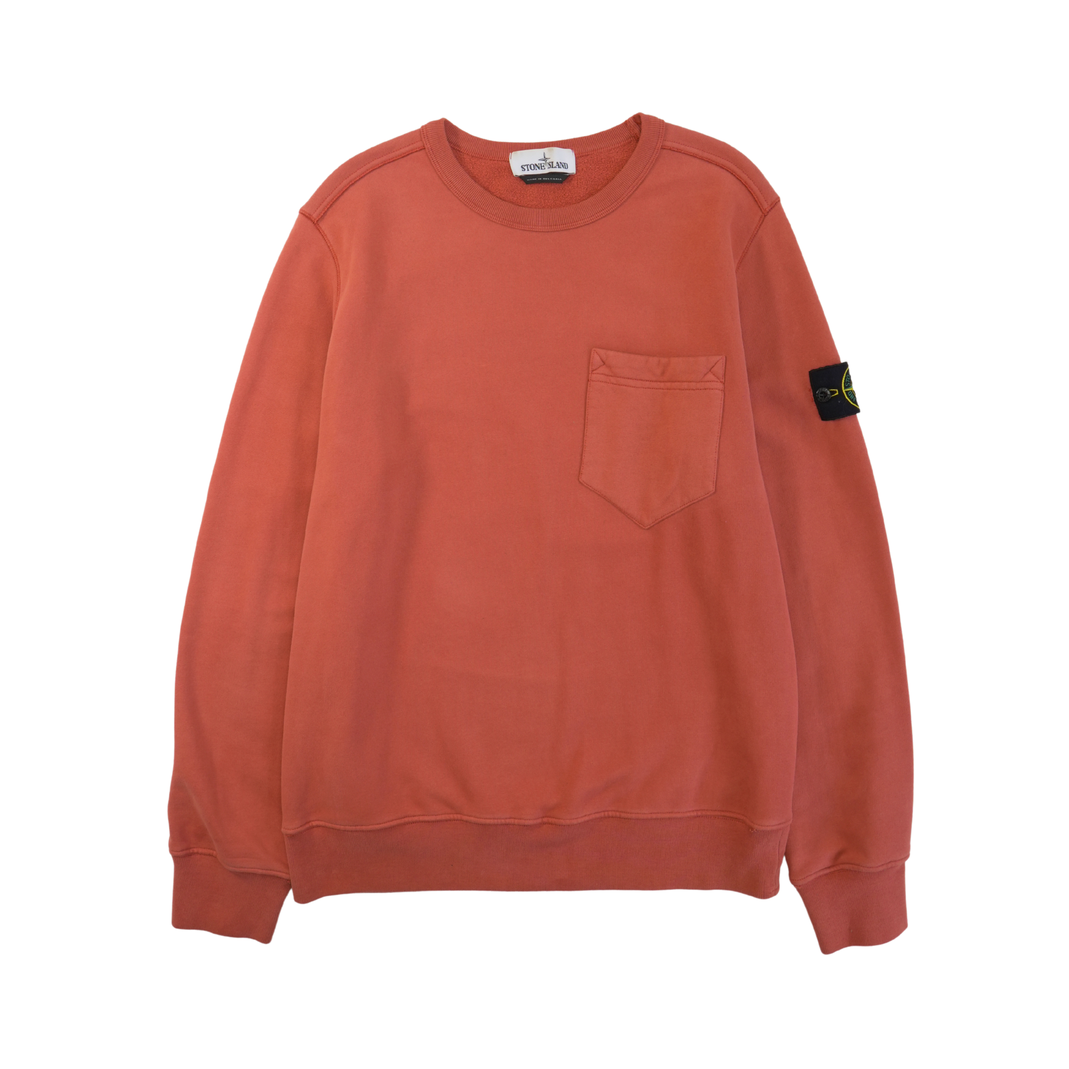 Stone Island crewneck sweatshirt in terracotta orange cotton with a chest pocket and a black logo patch on the sleeve.
