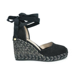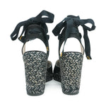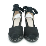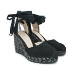 Stuart Weitzman wedge sandals in black canvas with a heel tab and lace-up ribbon closure. Features a grey and black twine wedge.
