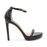 Stuart Weitzman heels in black patent leather with a stiletto heel and gold buckle hardware on the ankle strap.