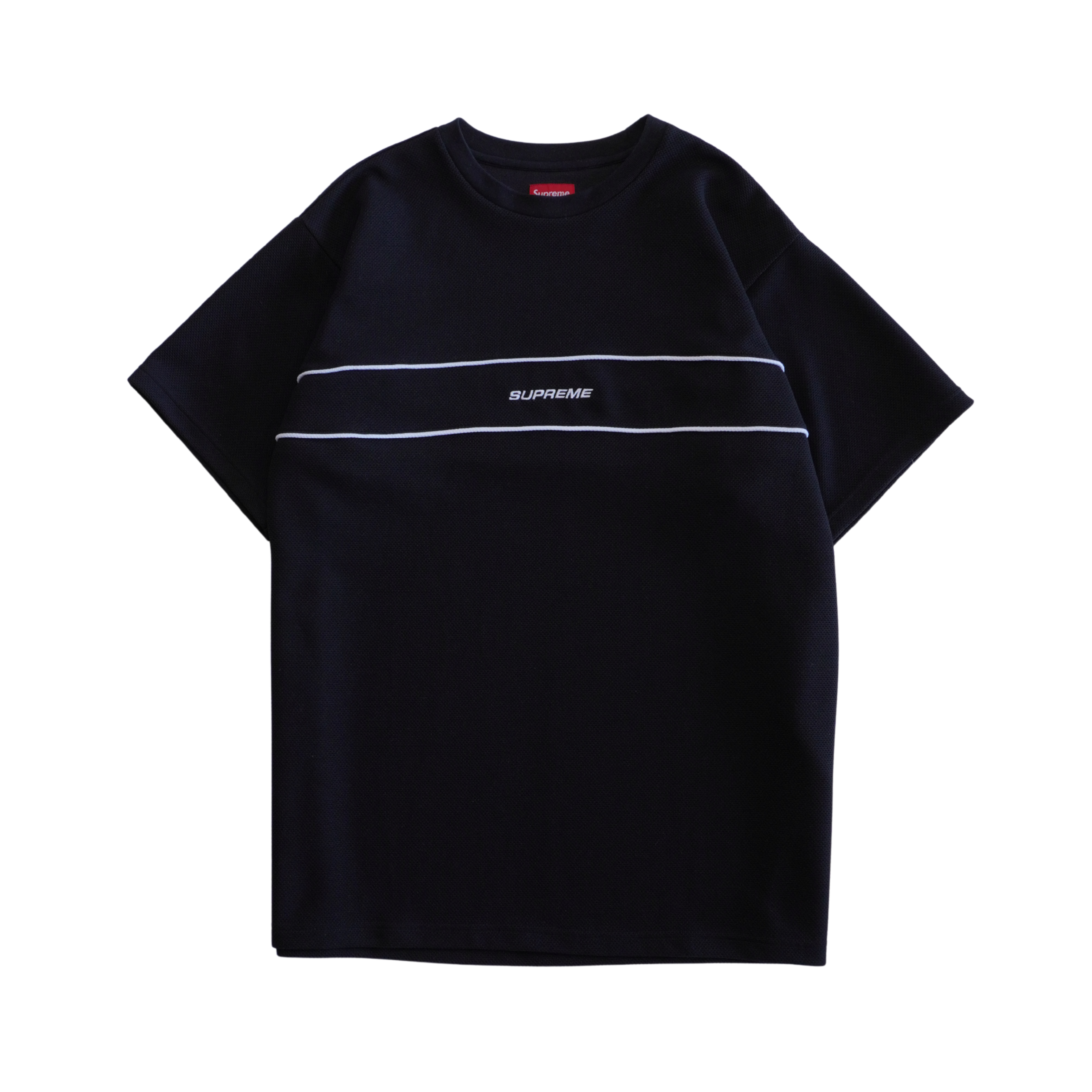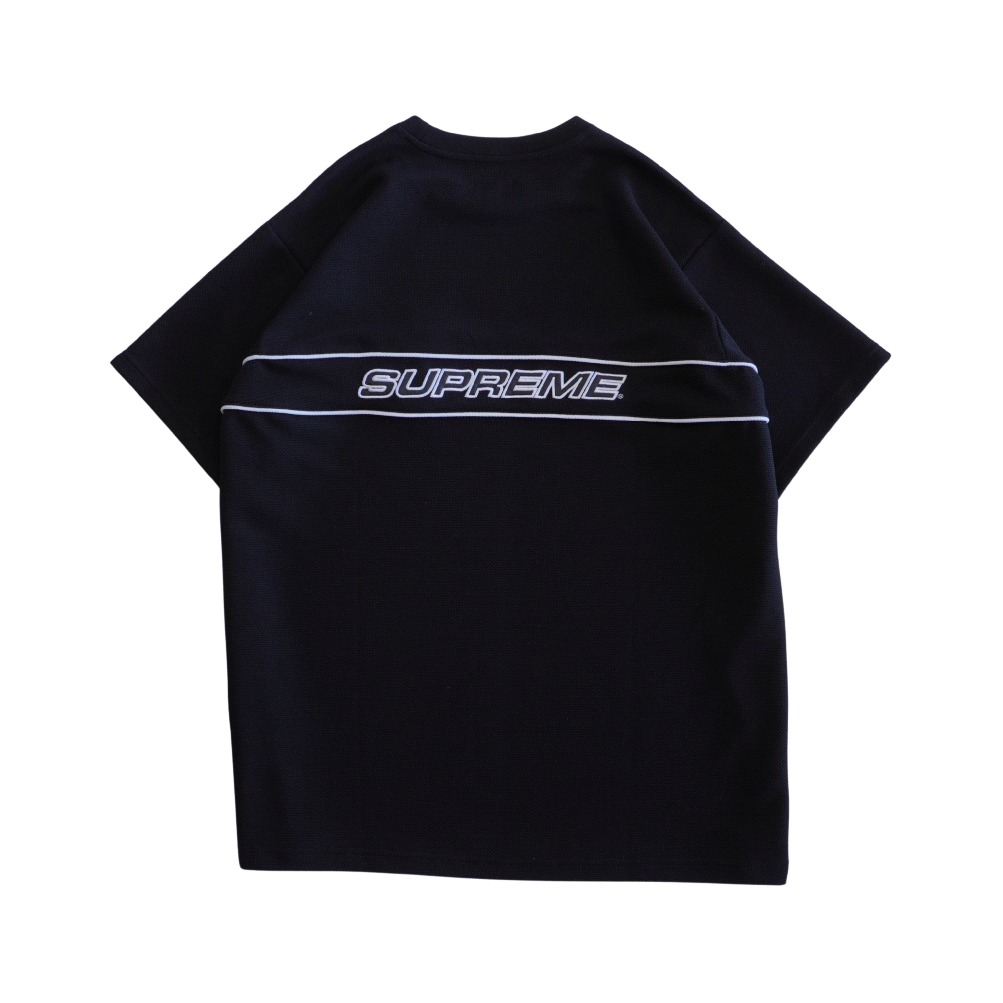 Supreme 'Piping Practice' t-shirt in black jersey polyester with an embroidered logo on the front, piping details around the chest and back, and a large embroidered logo on the back.