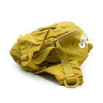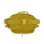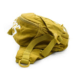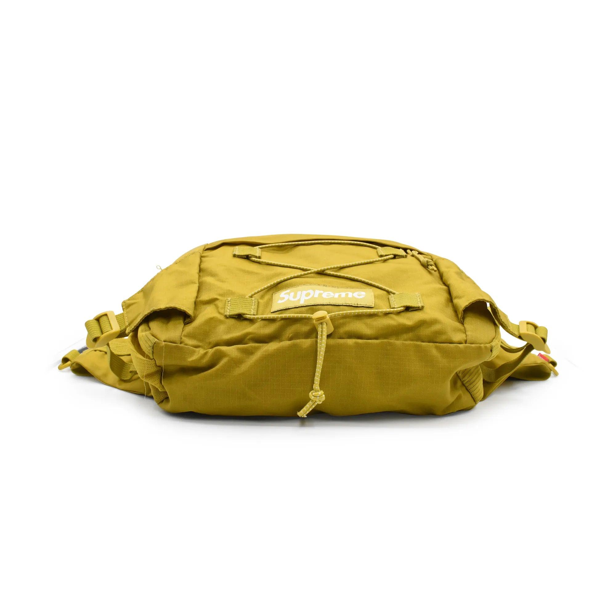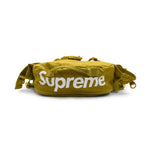 Supreme large fanny pack in mustard yellow nylon. Features white screen-printed logo on top of bag, adjustable belt strap with large buckle, a top handle, adjustable width straps, top zip closure, a front zip pocket, mesh side slip pockets, drawstring cord on the front, and white and yellow logo patch. The interior features two slip-pockets.