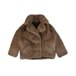 The Kooples jacket in taupe-brown faux fur with a double breasted front-button closure with large black buttons, side pockets, and a collar.