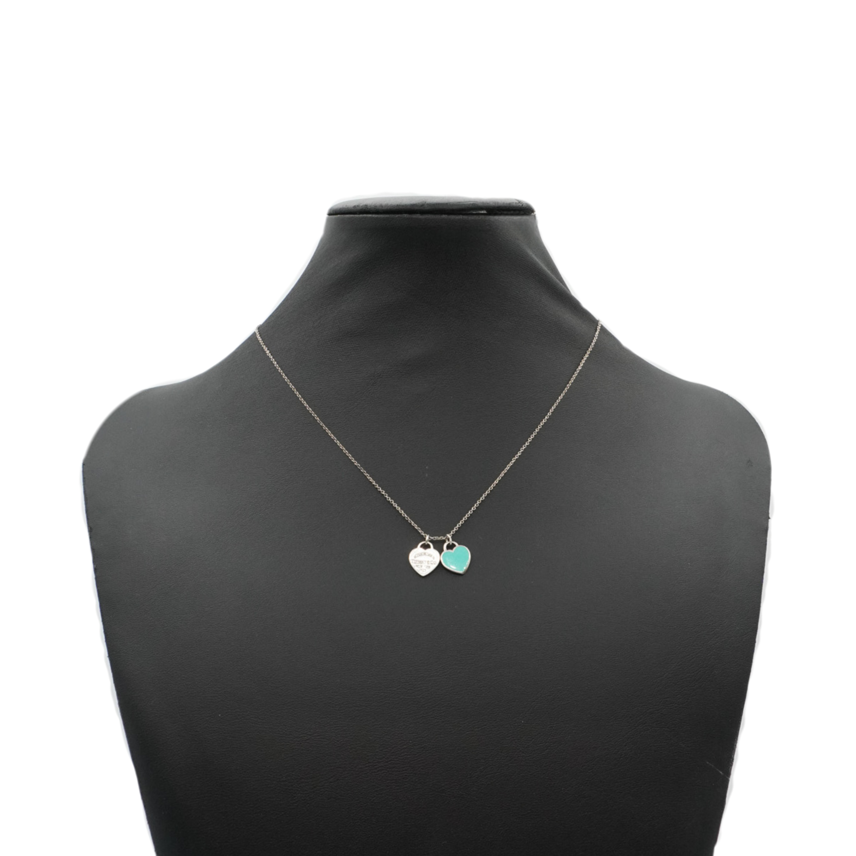 Tiffany & Co. solid sterling silver mini double heart tag pendant with enamel fill and Return to Tiffany engraving on a sterling silver chain.