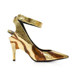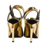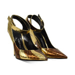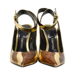 Tom Ford metallic gold and bronze pointed-toe slingback heels with snakeskin embossing, a wedge stiletto, and an ankle strap.