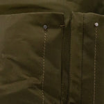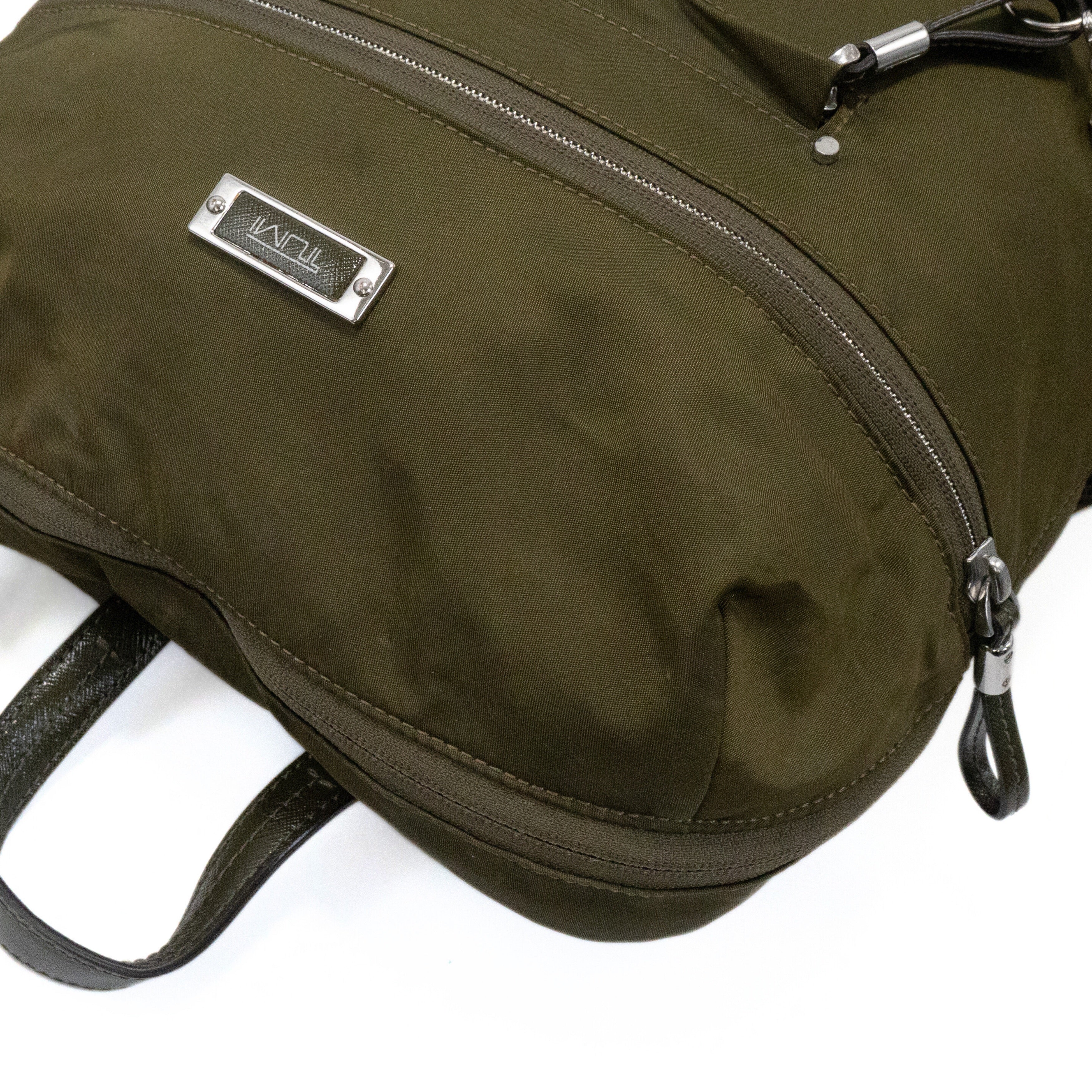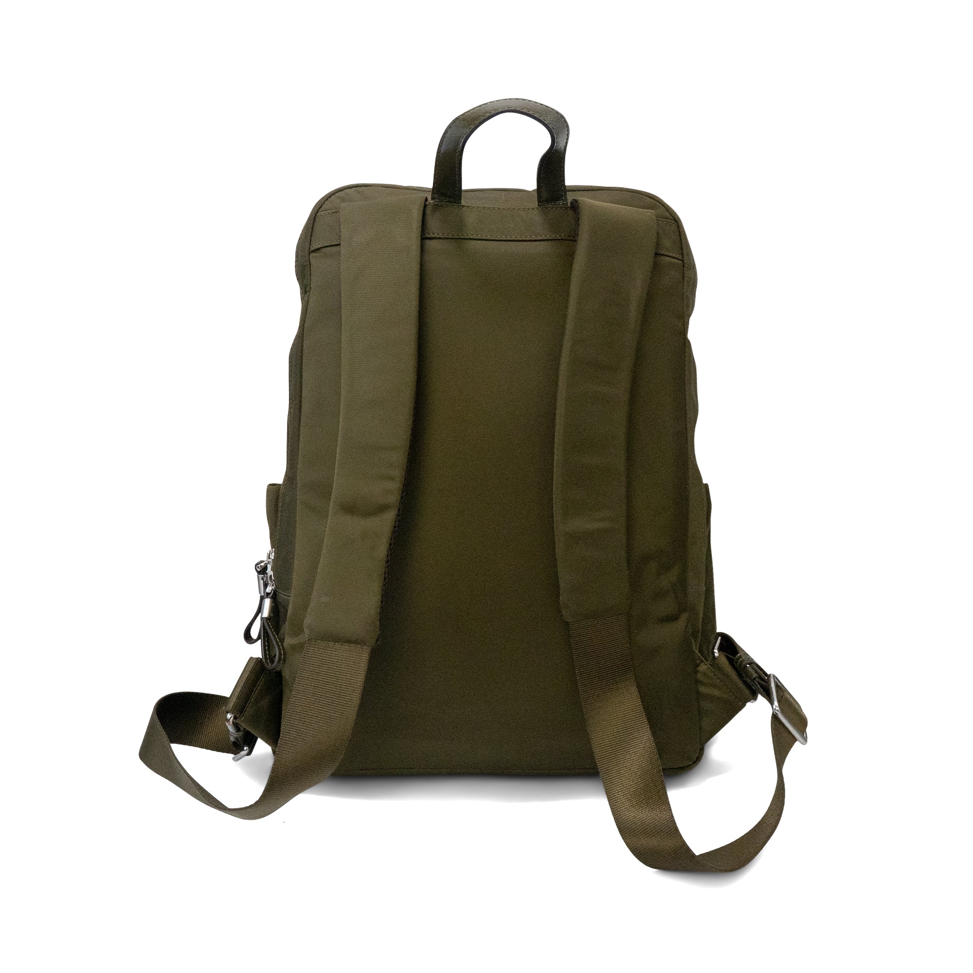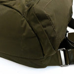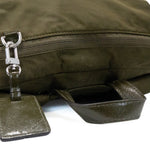 Tumi 'Voyageur' backpack in army green nylon with silver hardware details and beige interior. Features five outer zip pockets, one inner zip pocket, other small compartments in the main pocket, and silver metal logo plaque attachment.