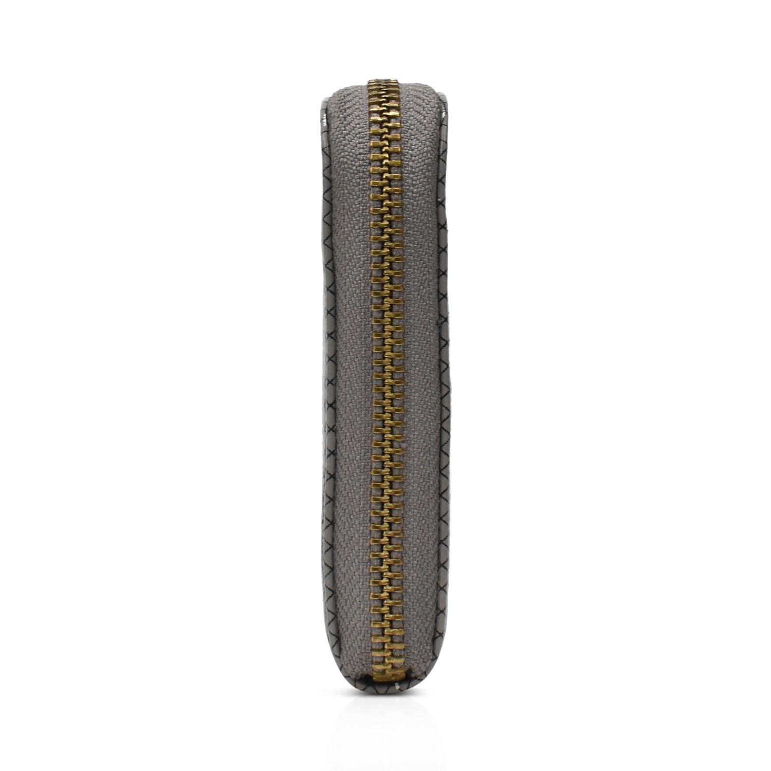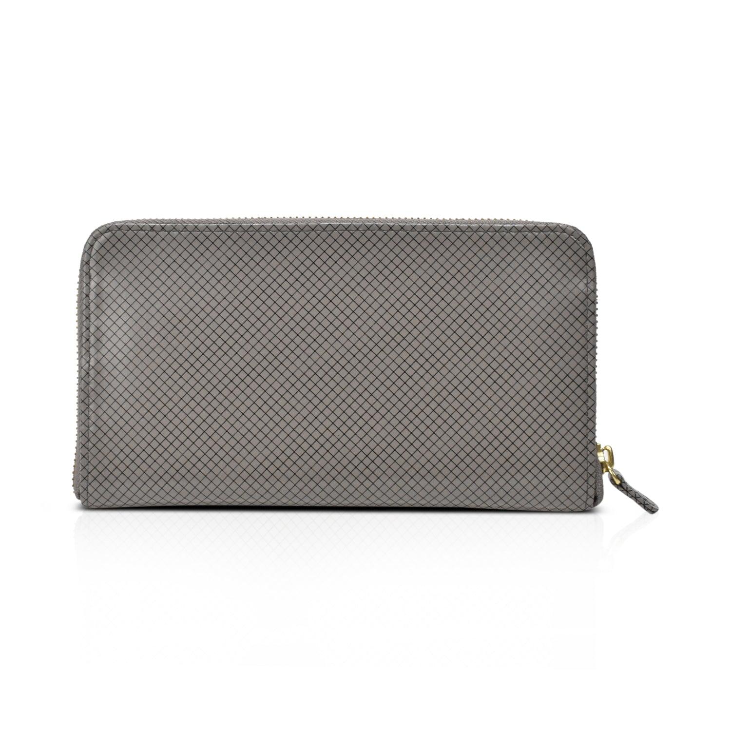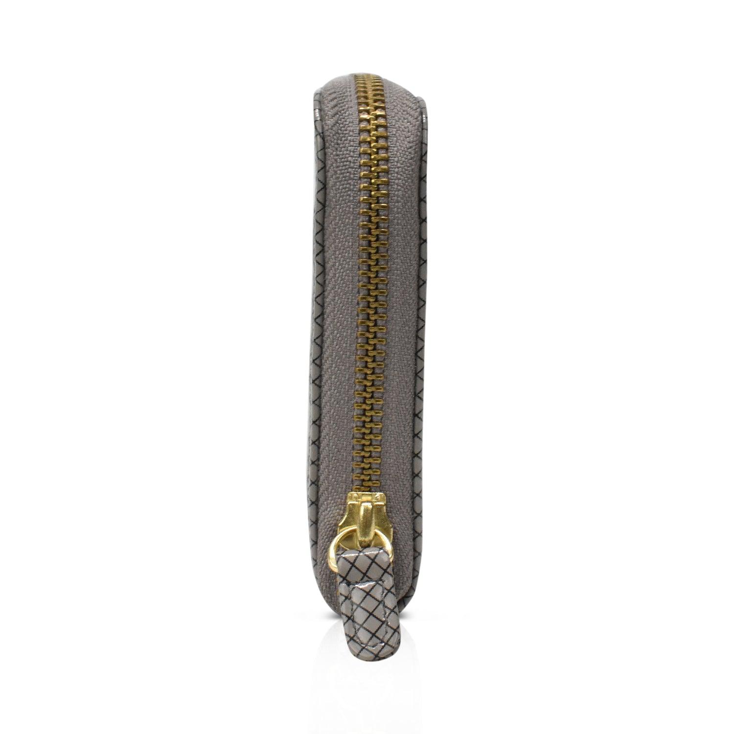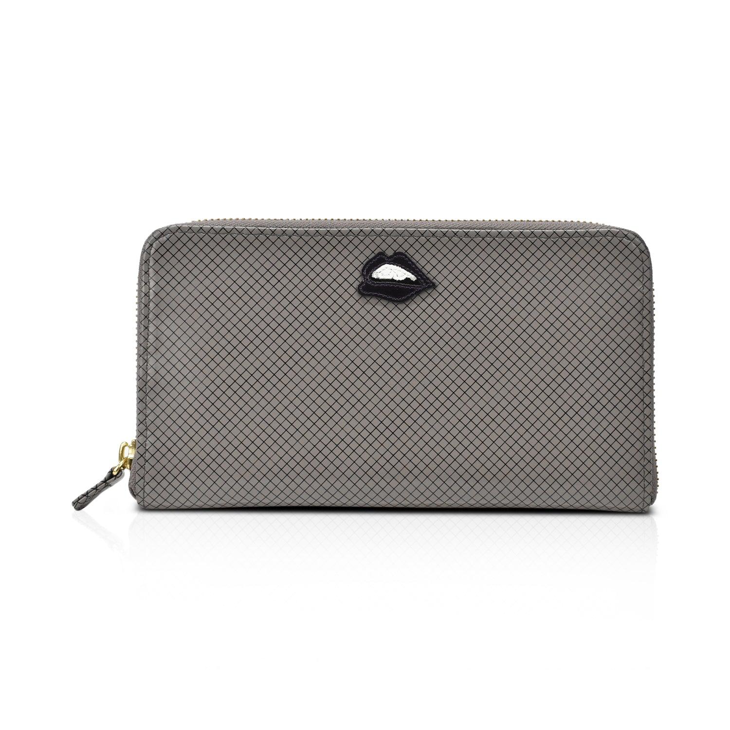 Undercover Continental Wallet in grey patent leather with a black checkered print and a purple lip stamp on the front. Features top zip closure in silver hardware, multiple card slots, inner zip pocket and teal blue leather.