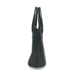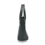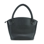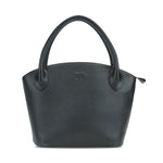 Valentino Vintage handbag in black-grained leather with rolled top handles, logo embossed on the front and a top center zip compartment.