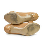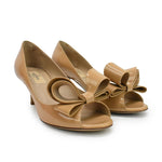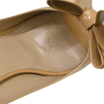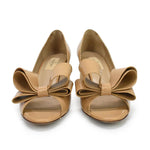 Valentino kitten heels in beige patent leather with a peeptoe and large bow detail.