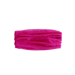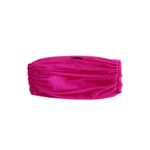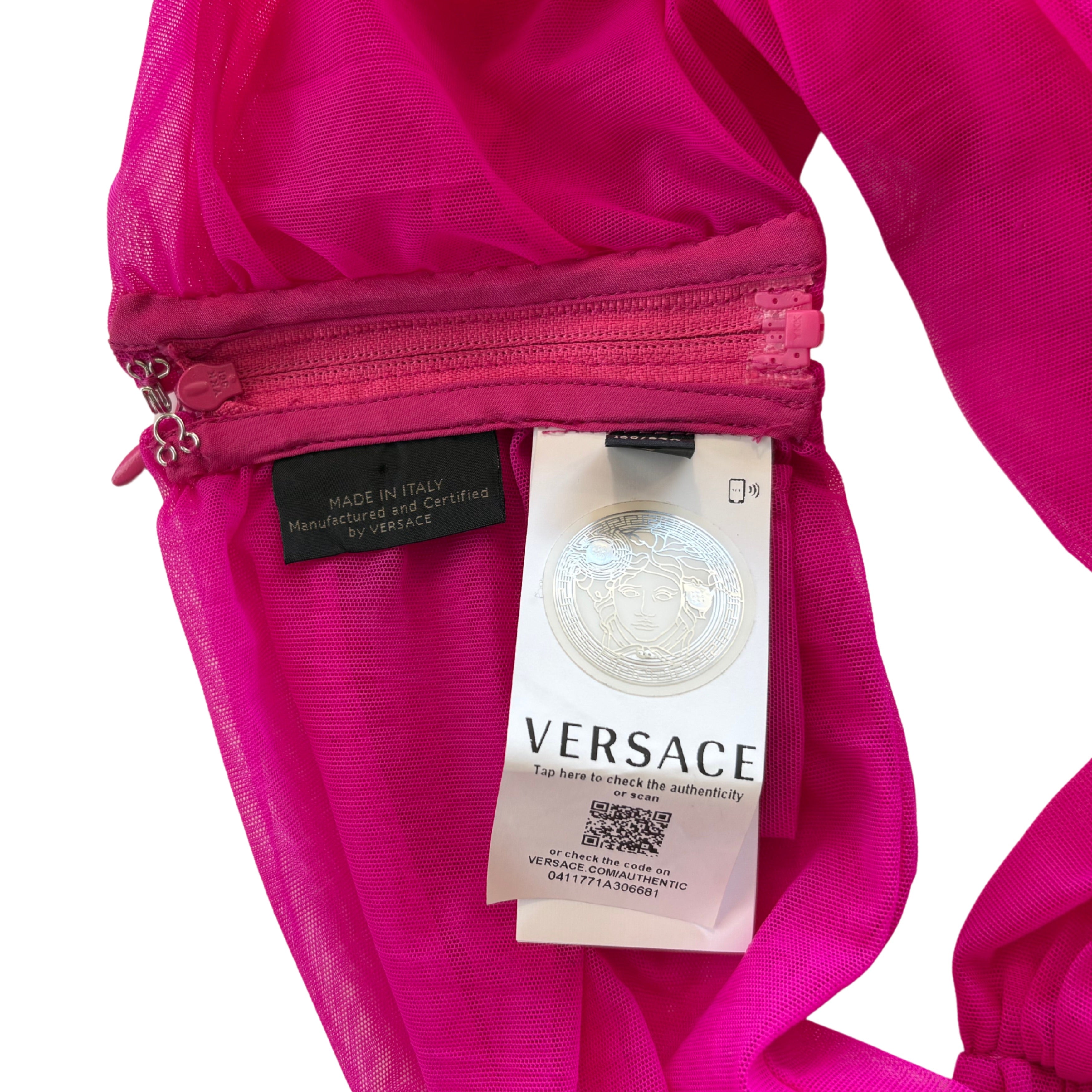 Versace bandeau top in magenta pink mesh tulle with ruching details and a hidden side seam zip opening.