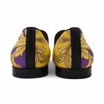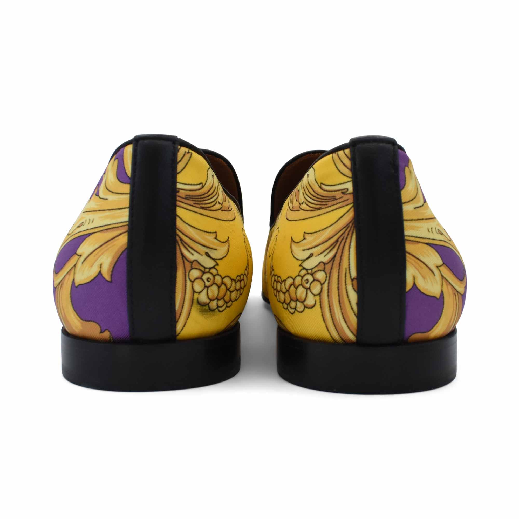 Versace loafers in purple and yellow satin with an all-over gold 'Barocco' print and black leather trim.