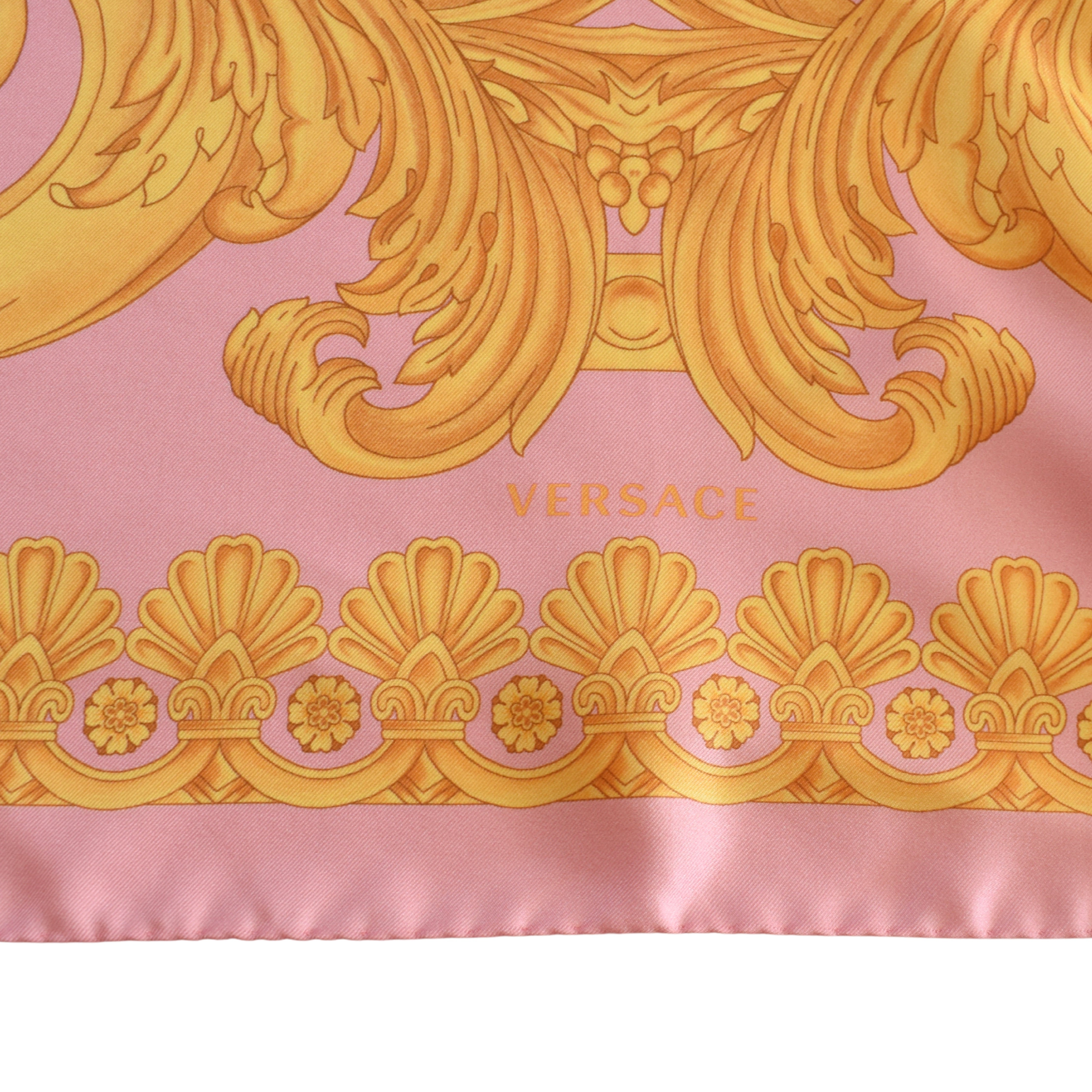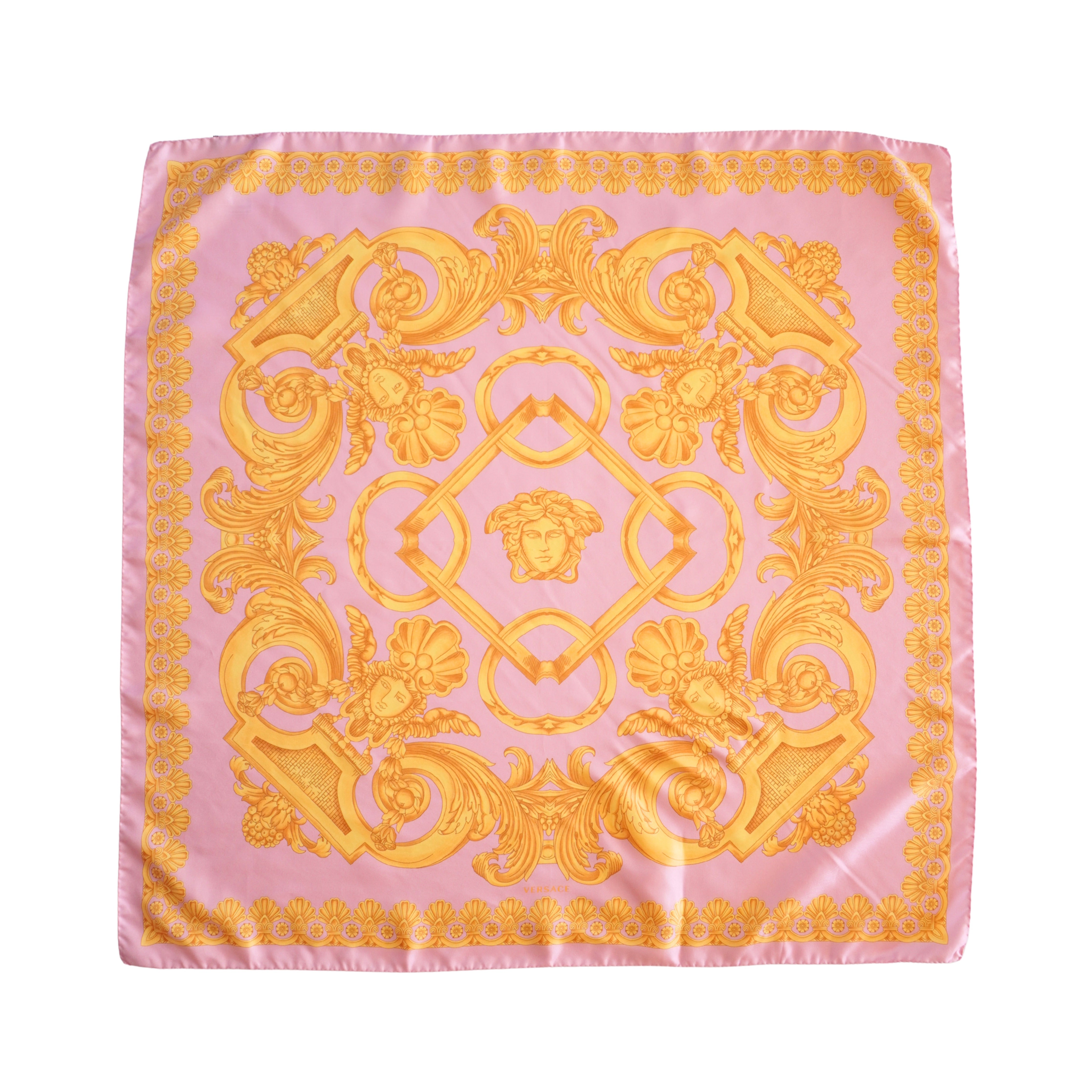 Versace 'Barocco' scarf in pink and gold silk with ornate design featuring Medusa head motif.