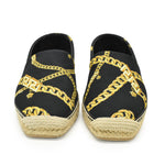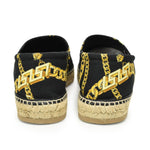Versace espadrille slip-on shoes in black with yellow chain baroque pattern. Features braided twine pattern around the sole. Comes with box.