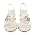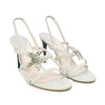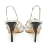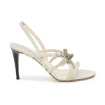 Versace heels in light grey suede with a beaded crystal star embellishment and multiple straps.