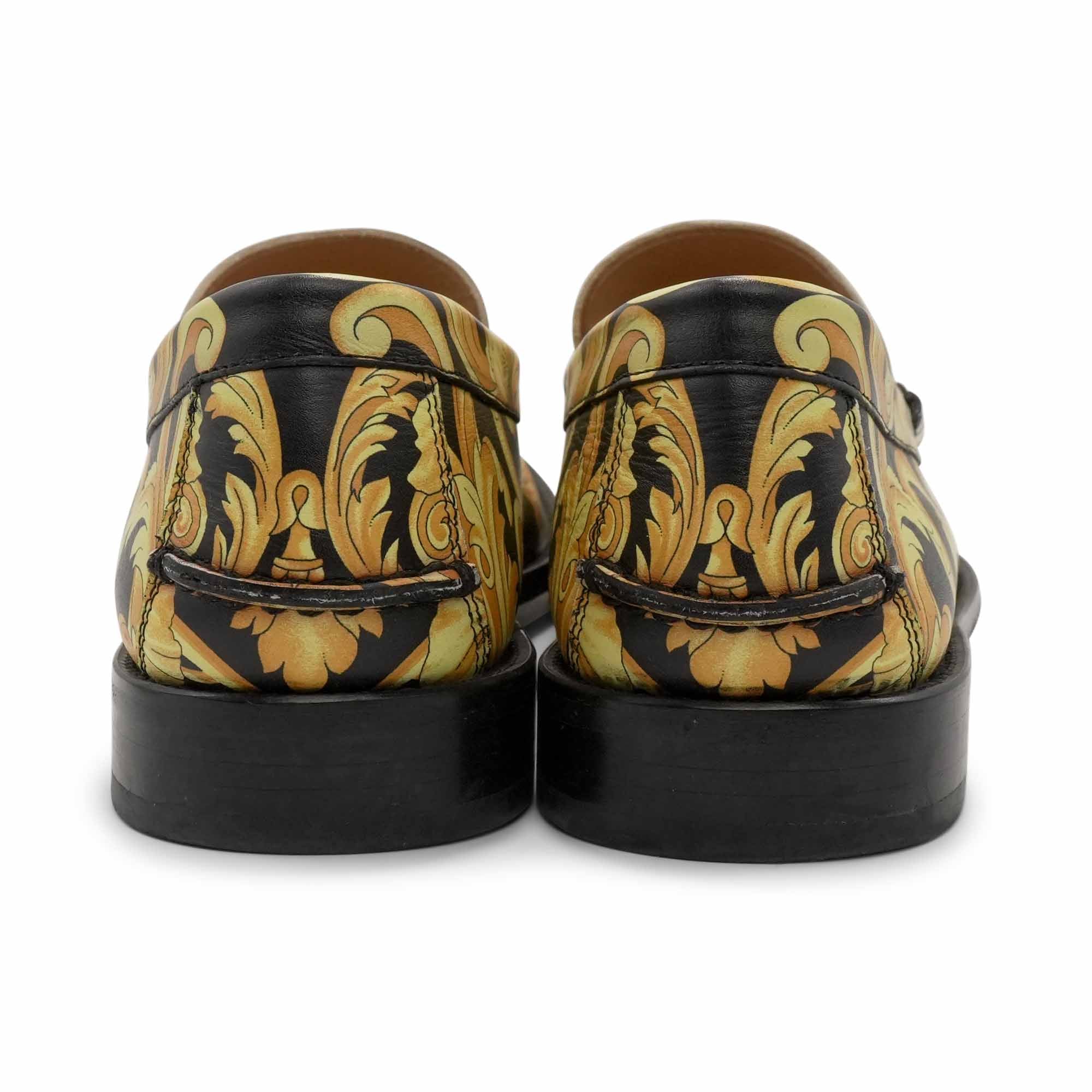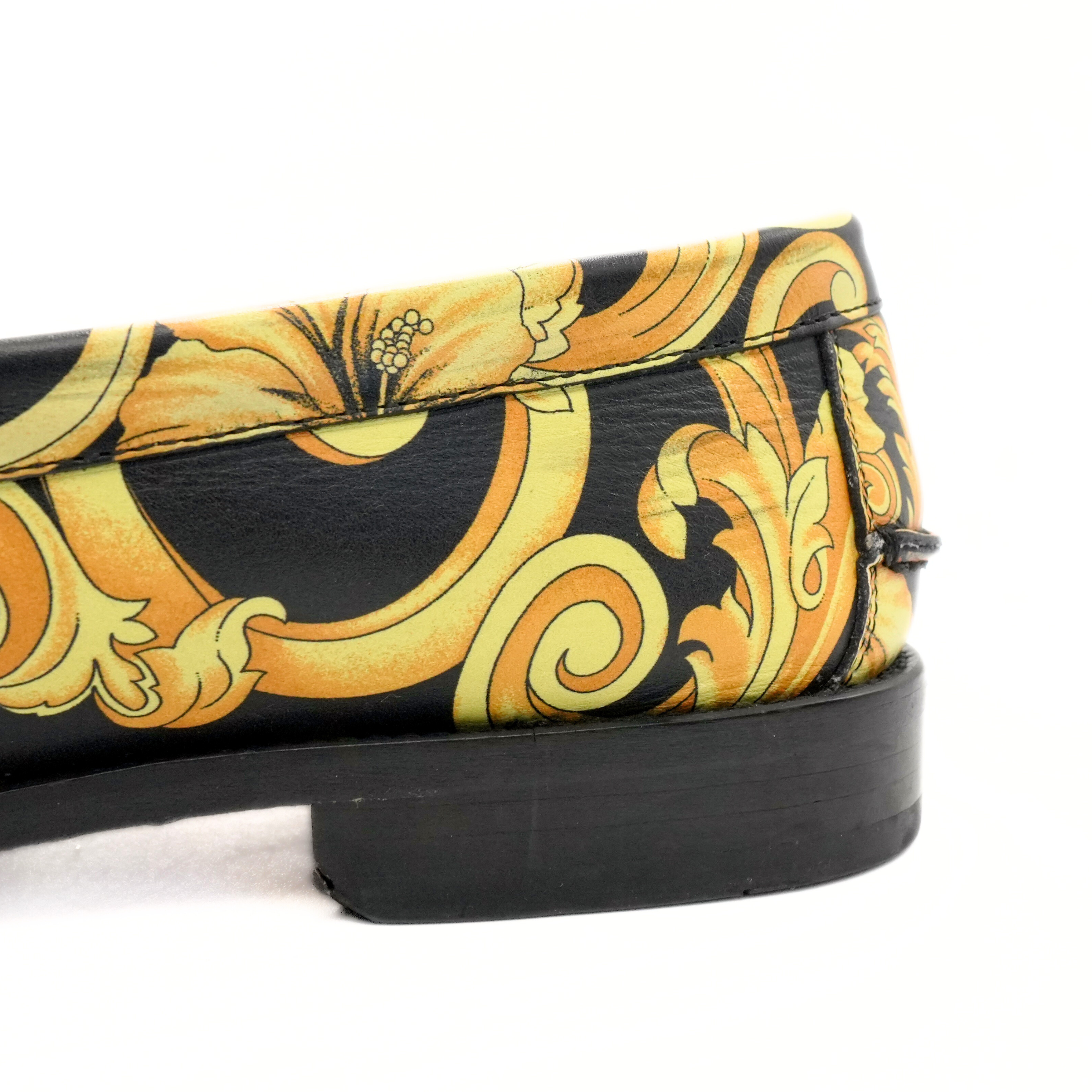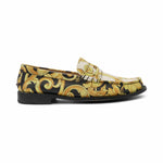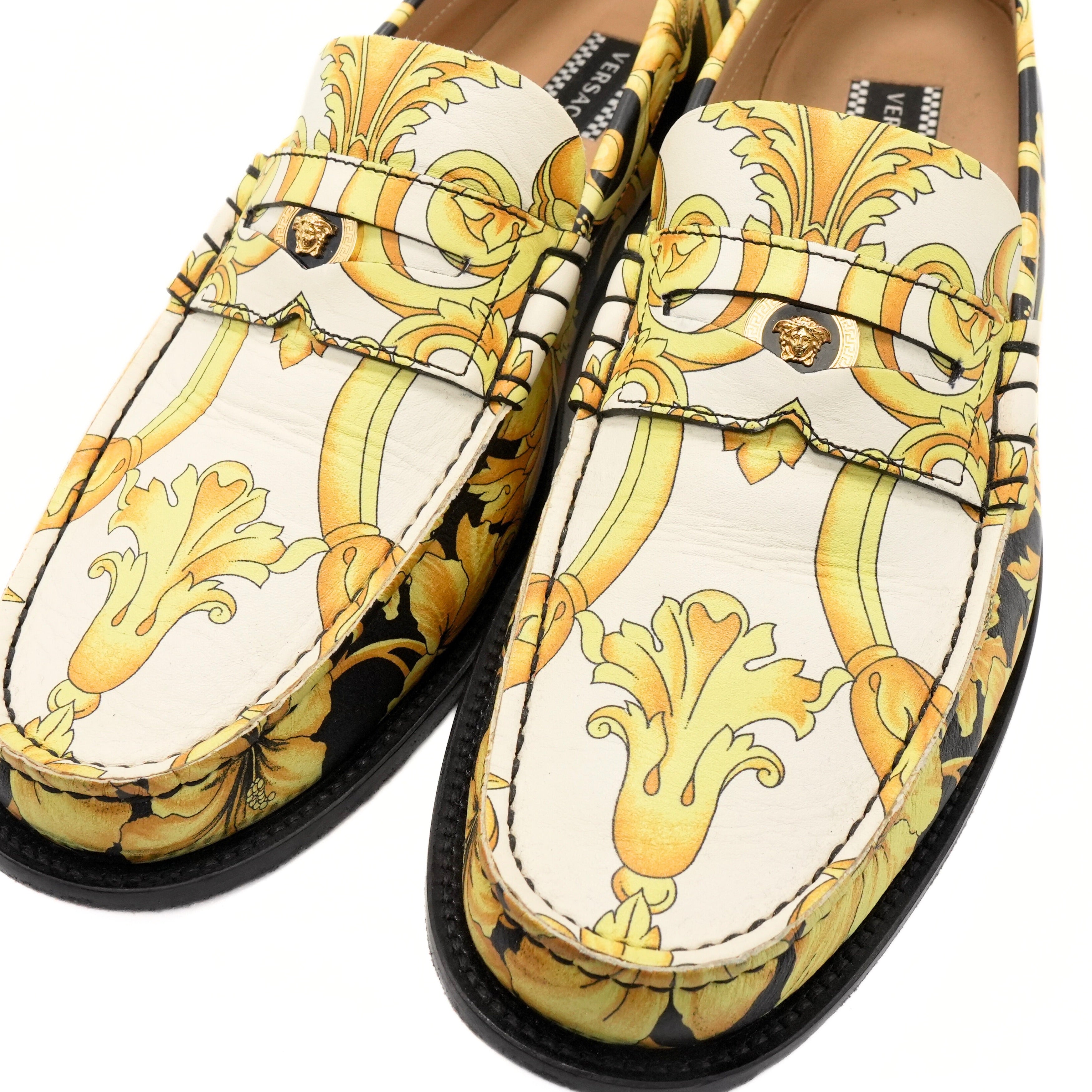 Versace penny loafers in black, white, and yellow 'hibiscus barocco' printed leather with a gold Medusa head emblem and a black wooden sole.