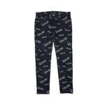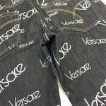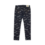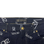 Versace jeans in dark wash blue denim with an all-over white monogram print, gold contrast stitching, and gold medusa head hardware.