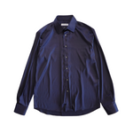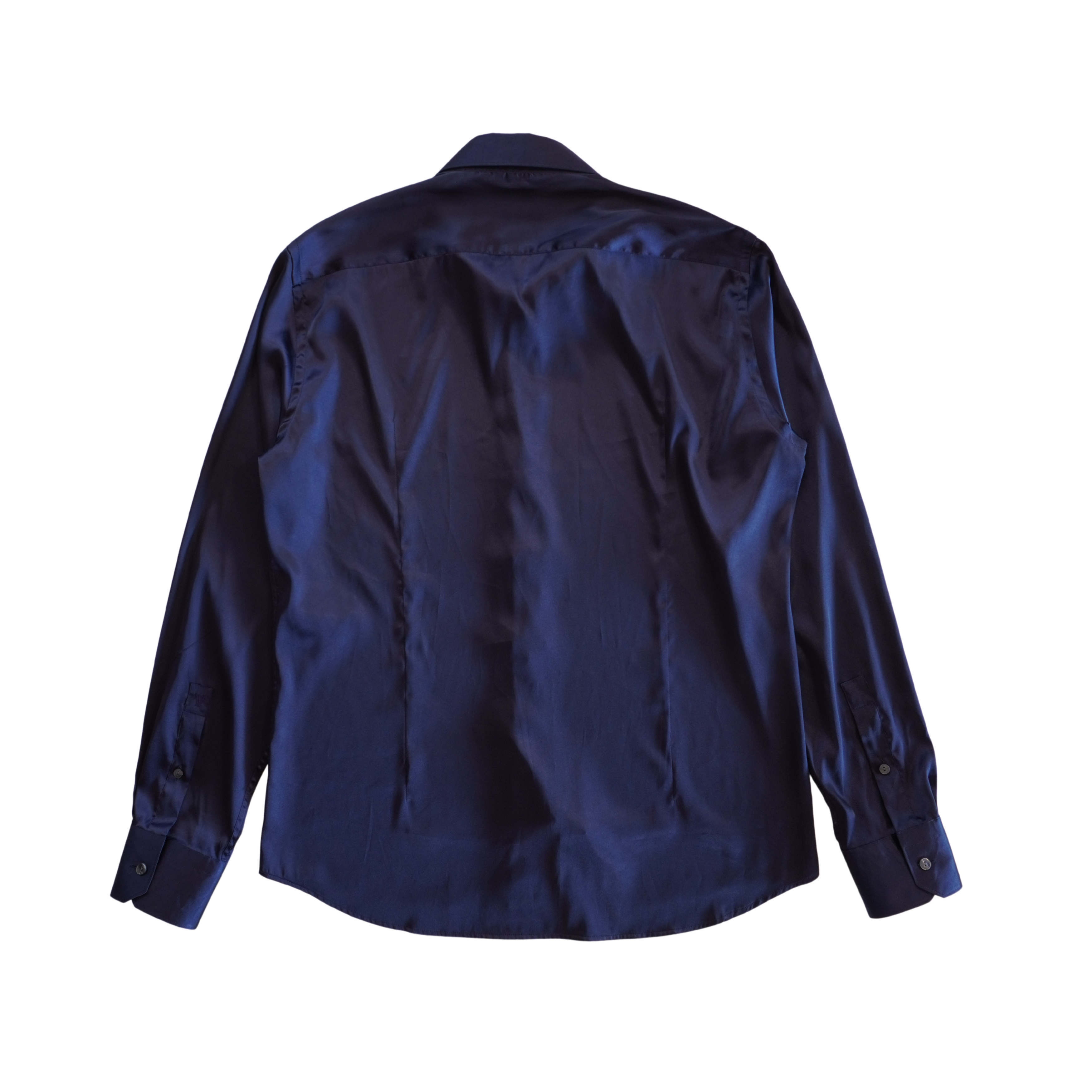 Versace Collection button-down shirt in navy satin with a point collar and iridescent silver buttons.