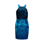 Versace babydoll embelleshed mermaid dress in blue metallic silk blend with rushing in the waist.