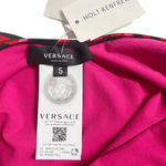 Versace one-piece swimsuit in a pink, red, and black monogram print with a white logo on the front chest and hot pink interior lining.