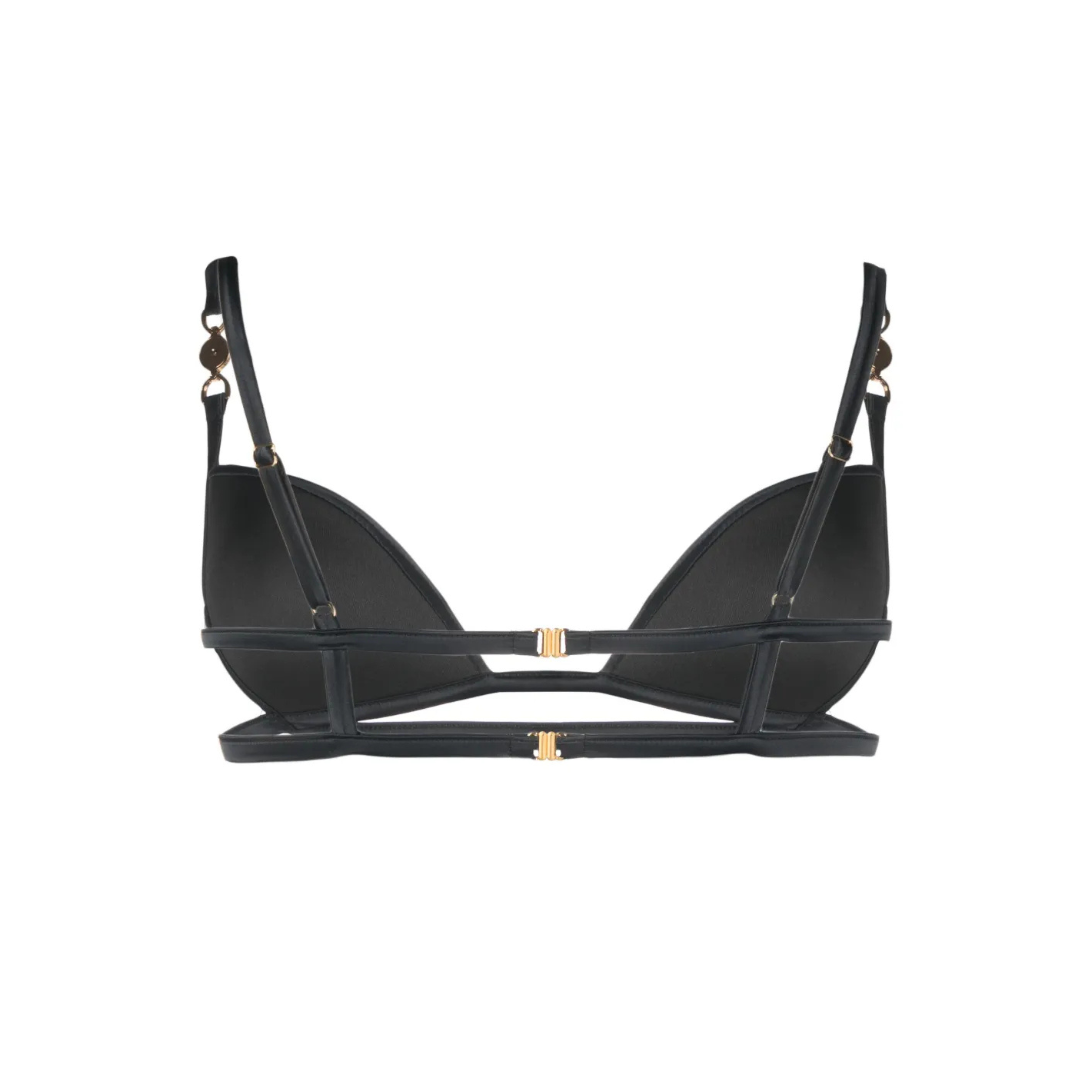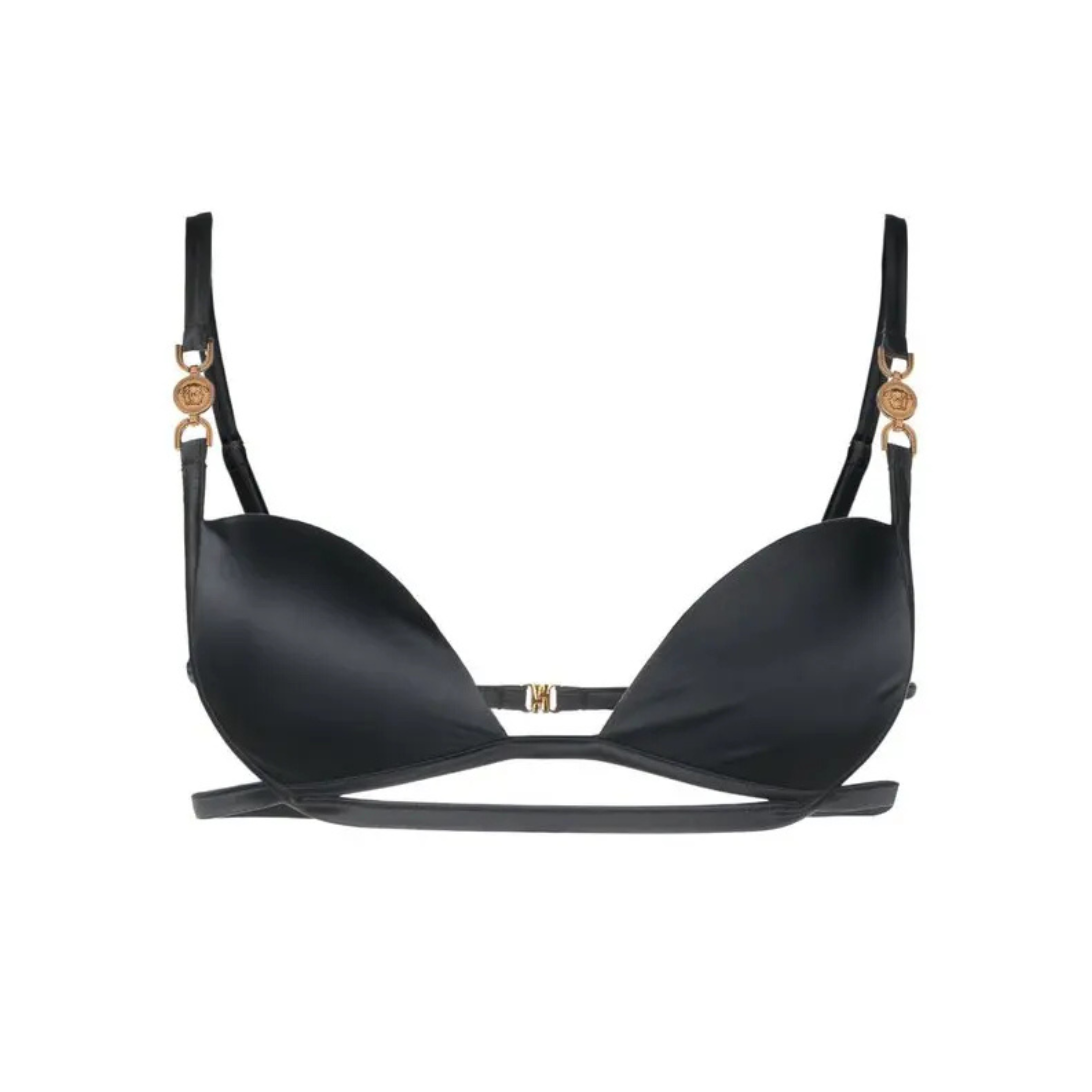 Versace x Dua Lipa 'Medusa '95' mini bra top in black satin with gold Medusa head links on the straps.