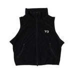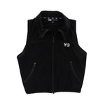 Yohji Yamamoto sleeveless cropped mock neck top with full zip up and a white embroidered 'Y-3' on the top left and two front zip pockets.