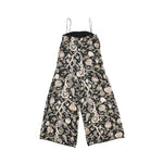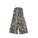 Zimmermann Jumpsuit in black with a pink and green floral print. Features spaghetti straps and a square neckline.