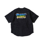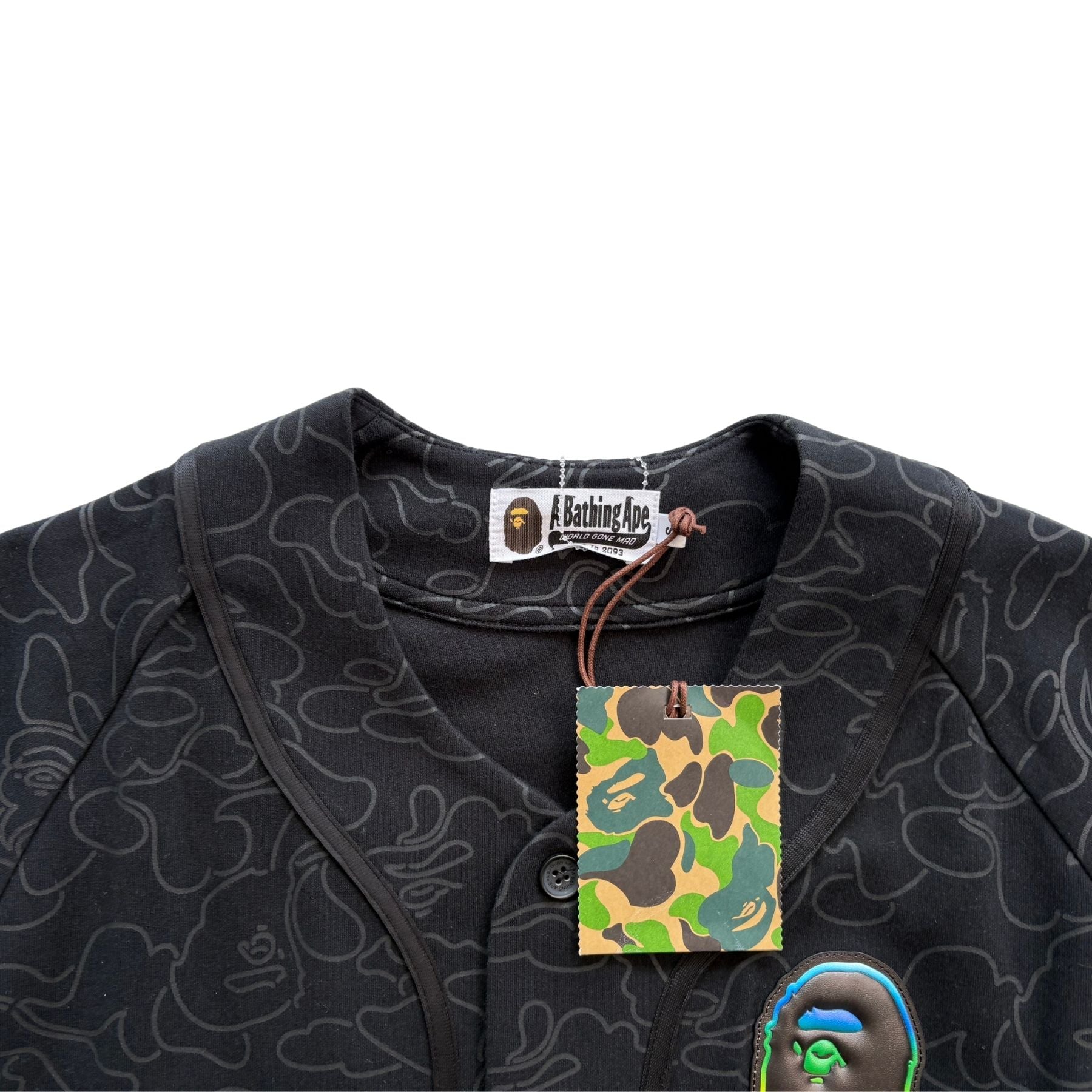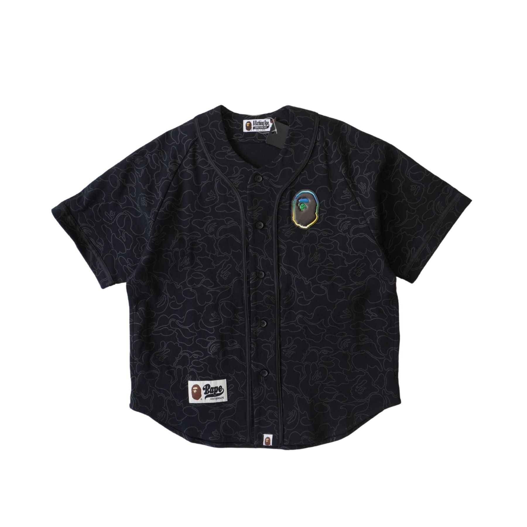 A Bathing Ape 'Line Camo' jersey shirt in a thick black cotton blend with an all-over tonal ape camo print, a front-button closure with black buttons, a leather ape logo patch on the chest, and an embroidered 'BAPE' graffiti patch on the back.