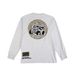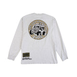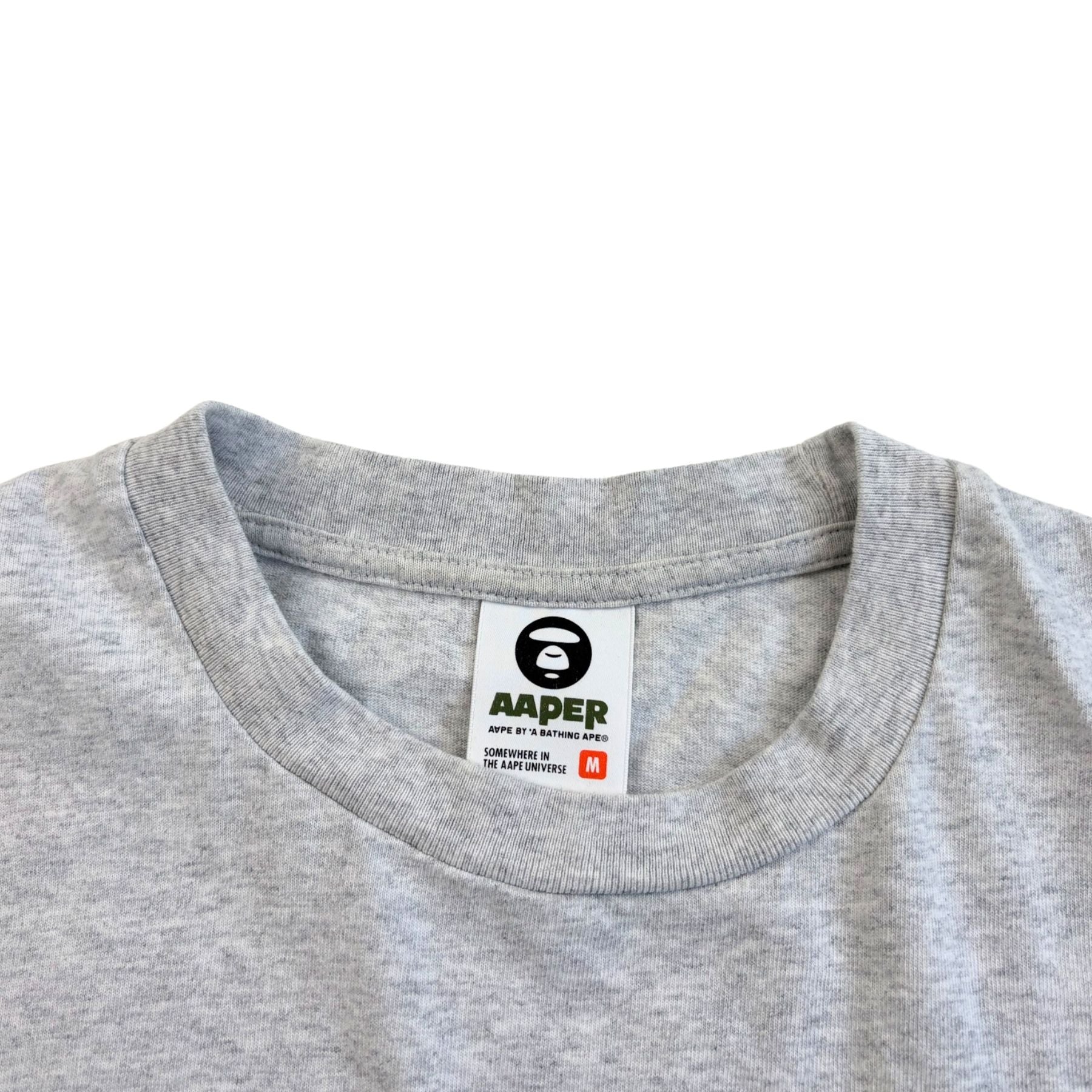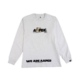 AAPER by A Bathing Ape 'Camping' long-sleeve t-shirt in heather grey cotton with a velvet black and brown camping graphic on the front, a large matching car graphic on the back, and an olive green logo patch on the back hem.