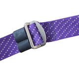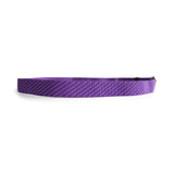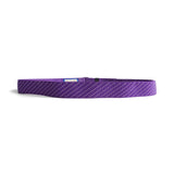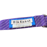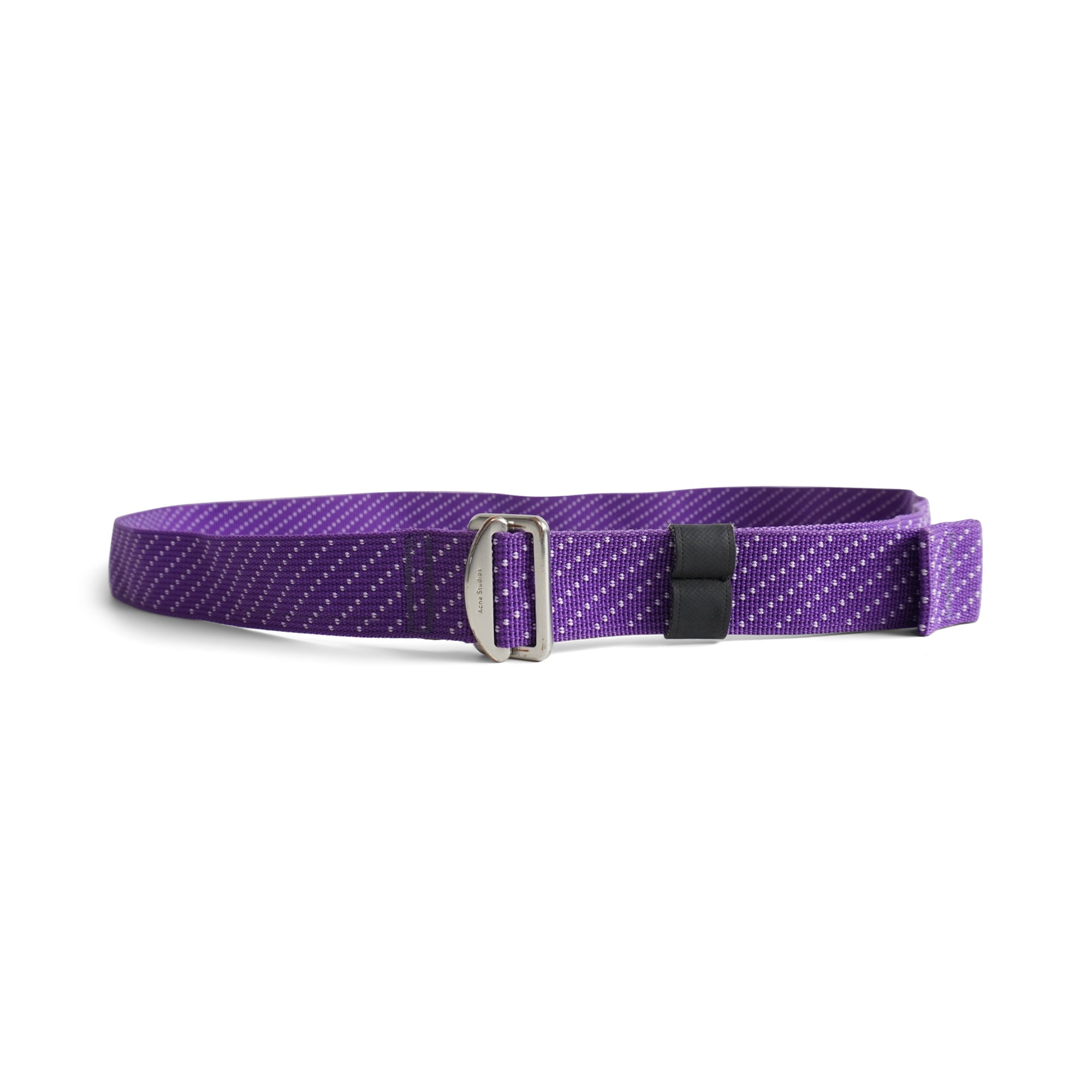 Acne Bla Konst belt in purple canvas with all-over white diagonal dots, an aged brass d-ring buckle and a black leather tag.