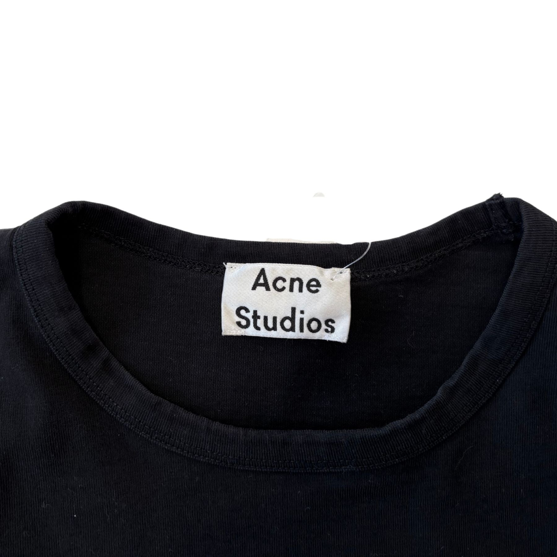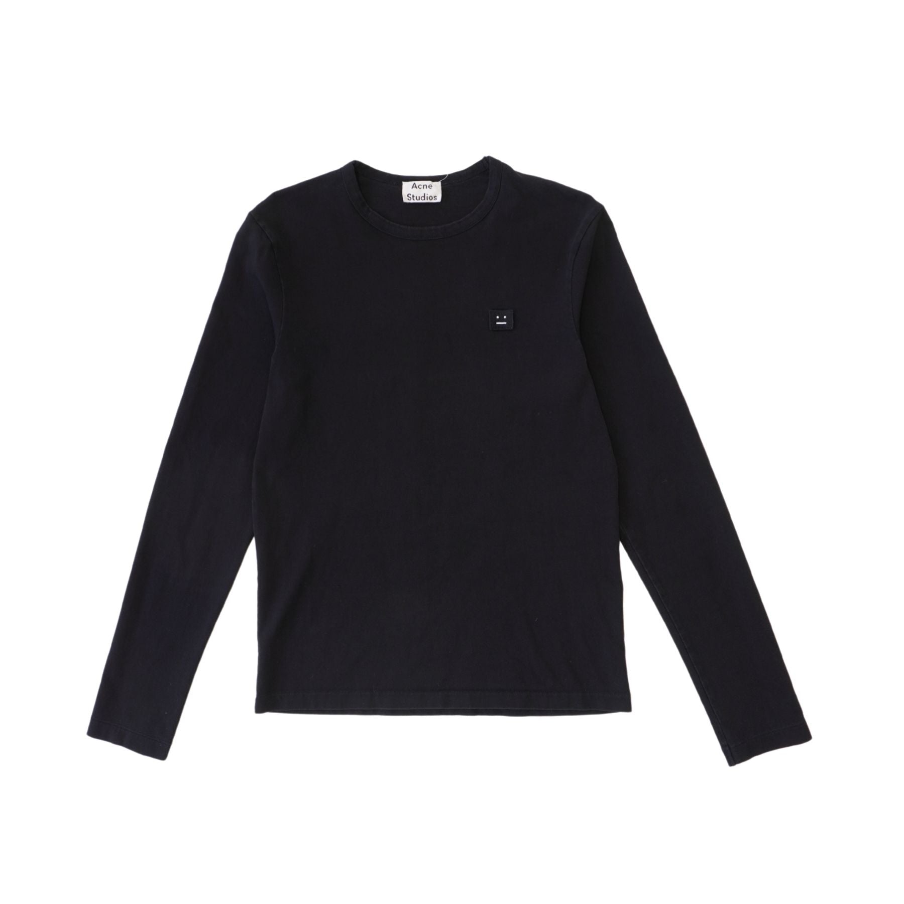 Acne Studios long-sleeve top in black cotton. Features a small black logo face patch on the chest with white detailing.