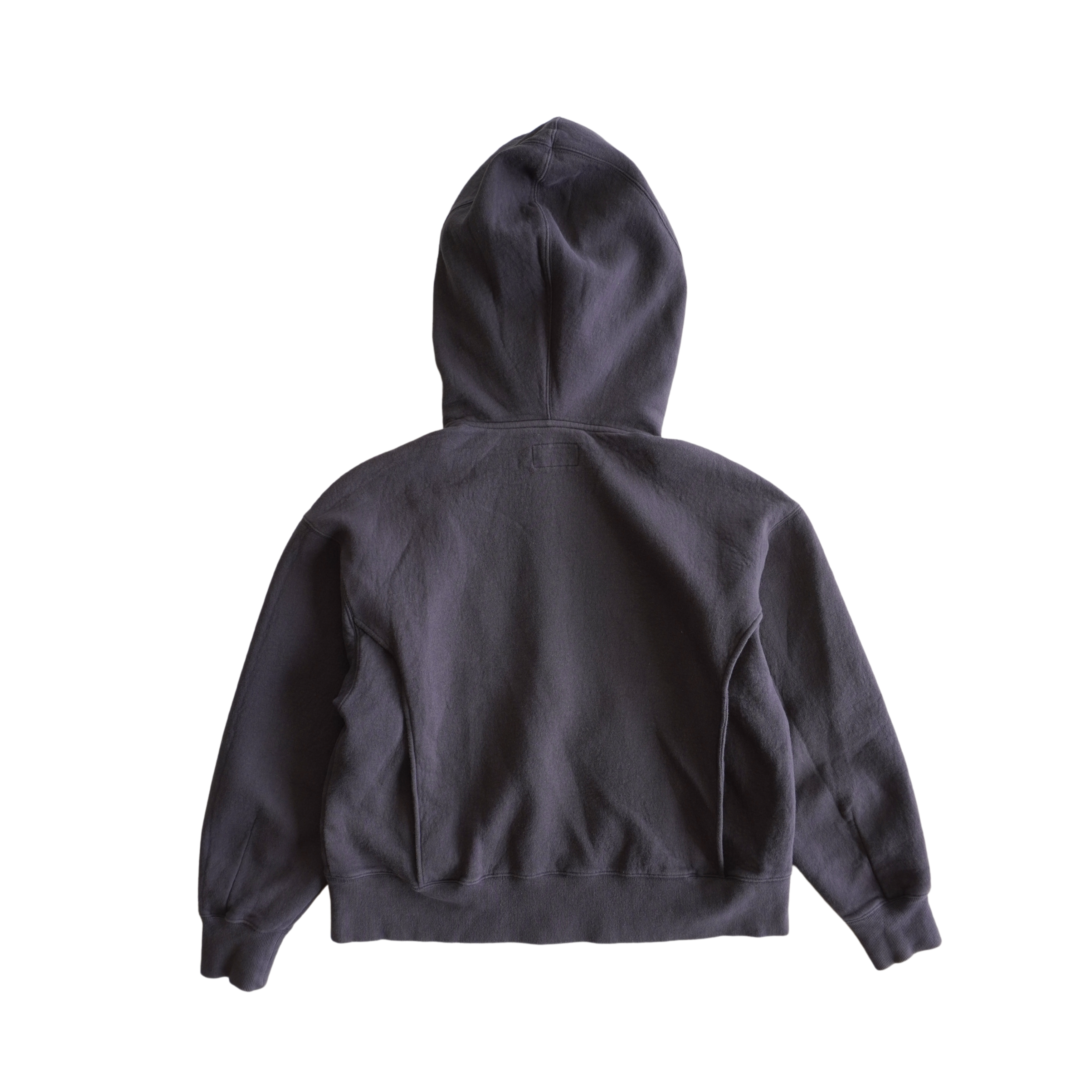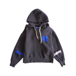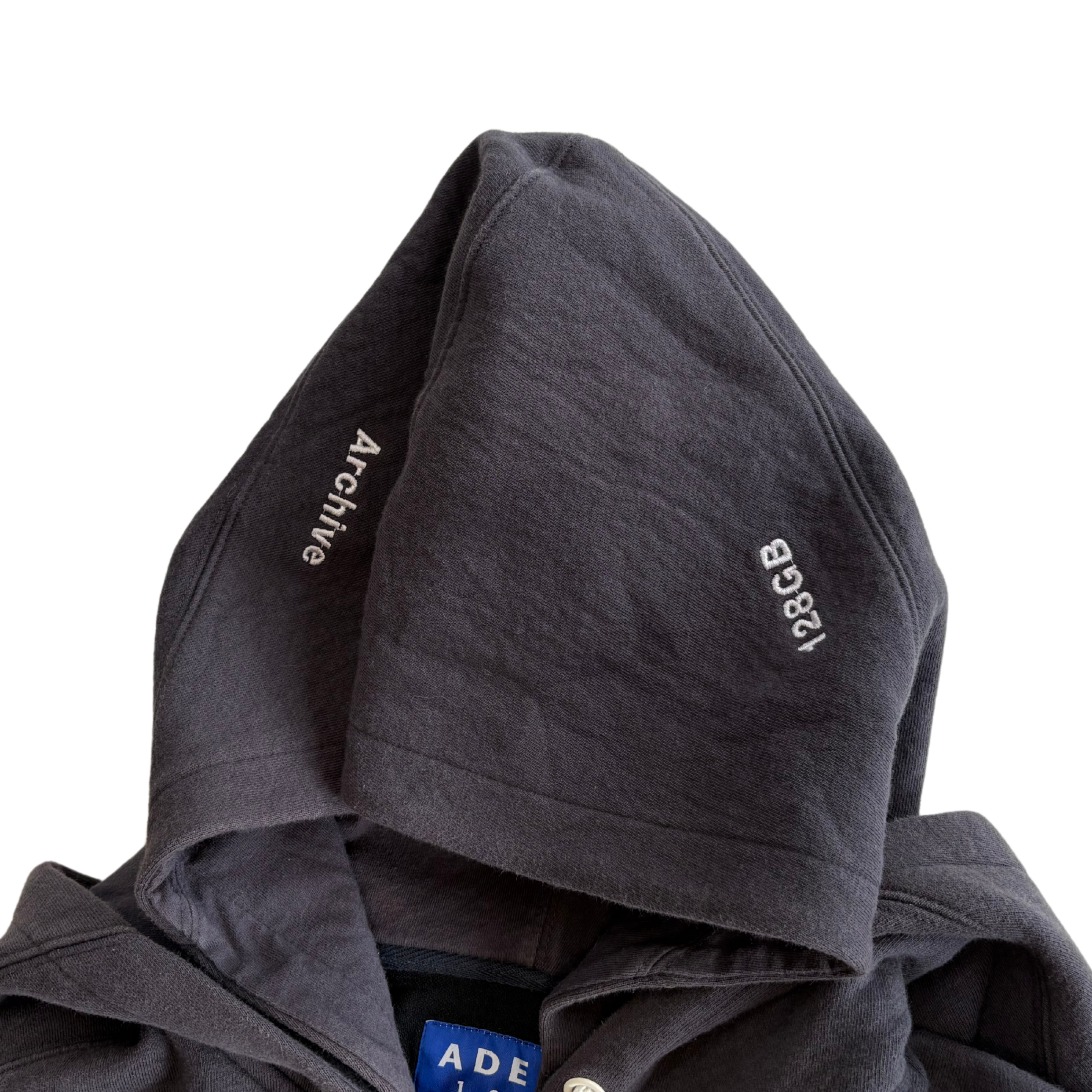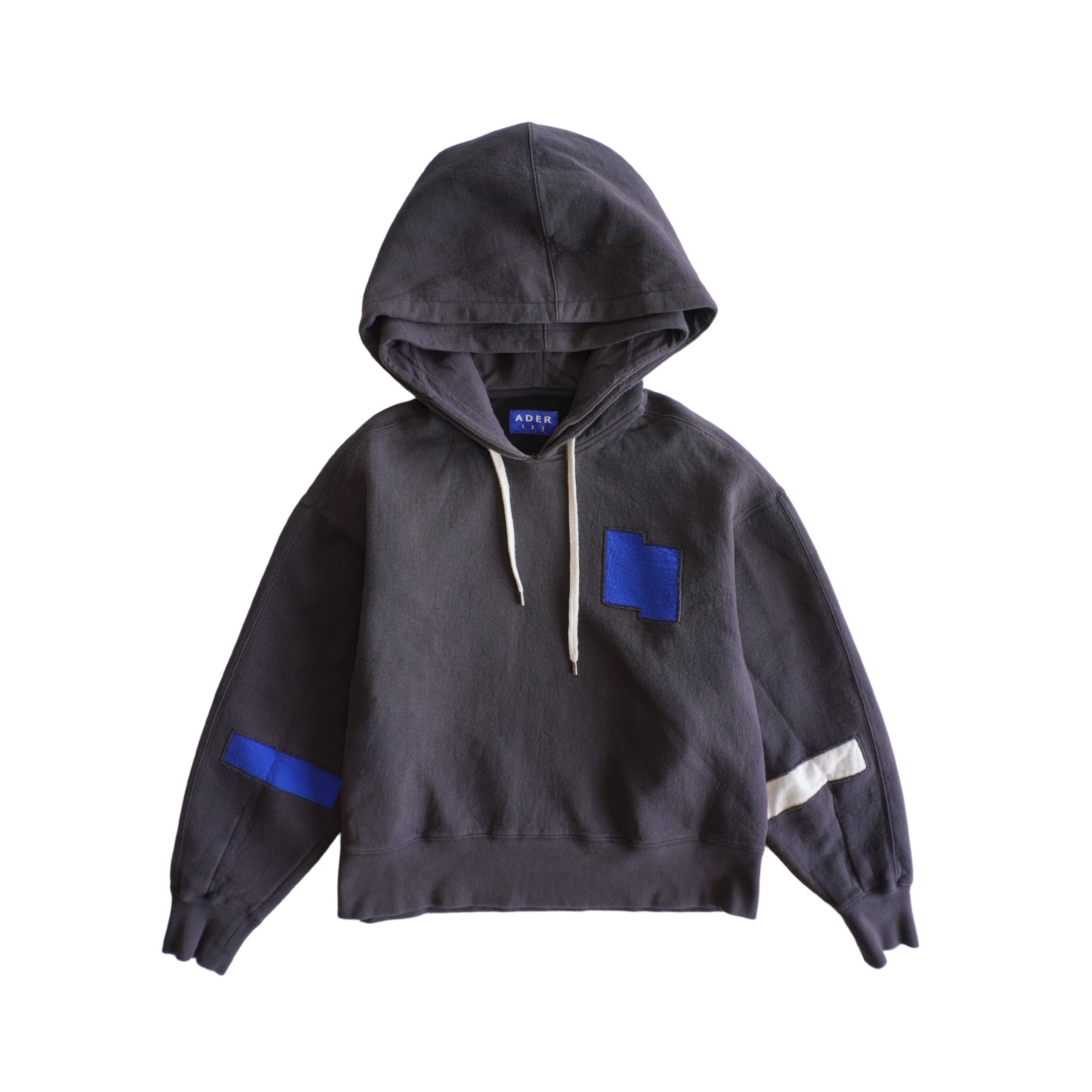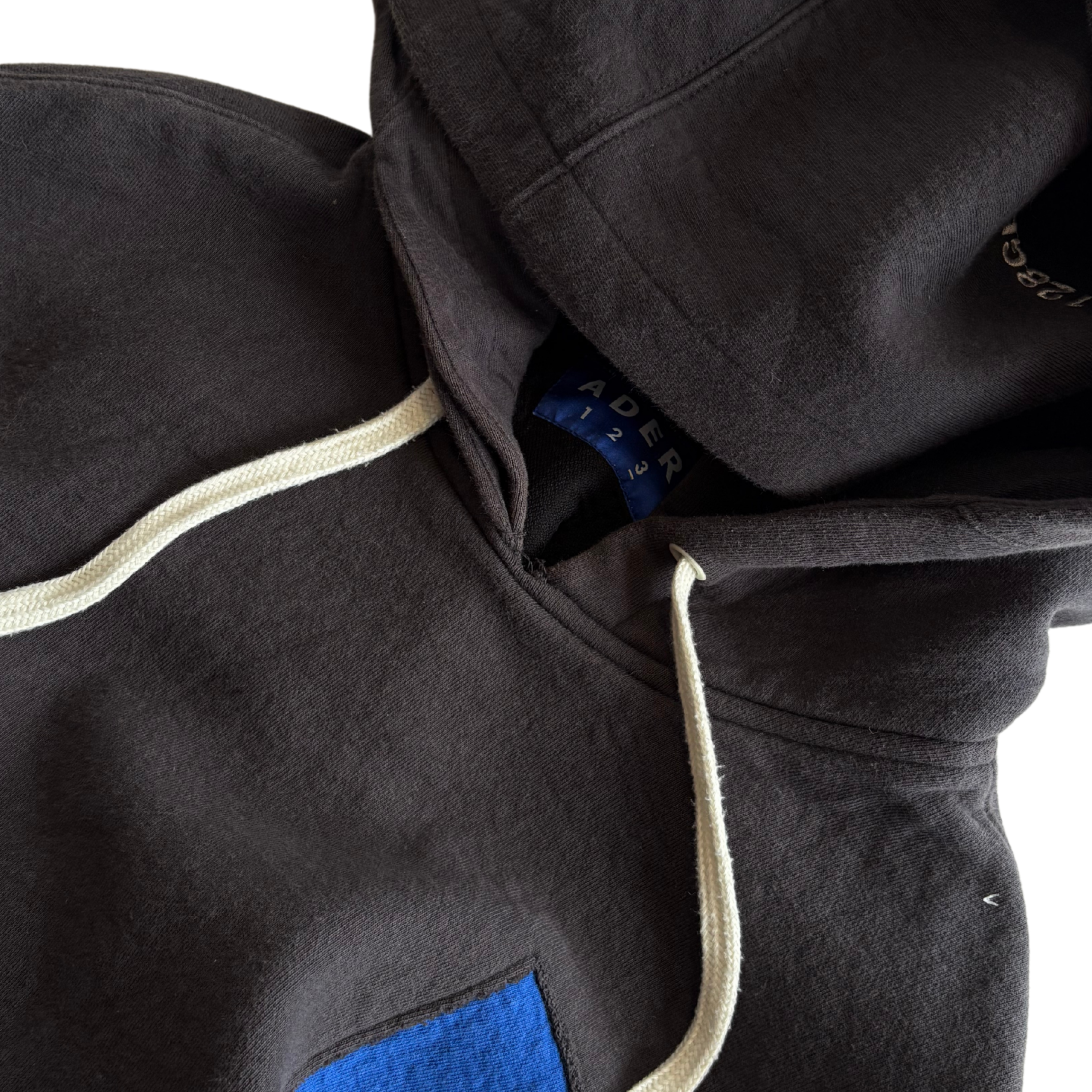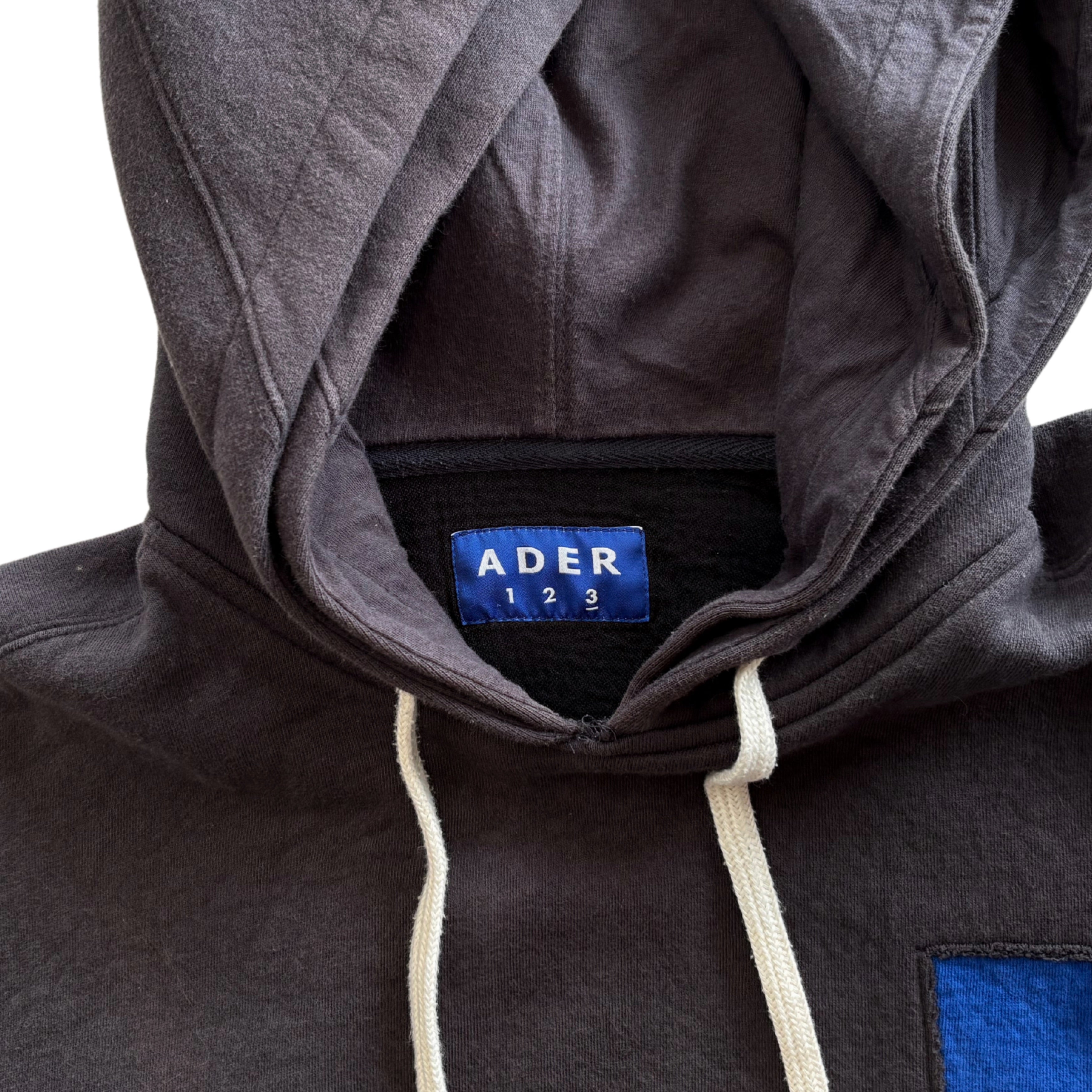 Ader Error charcoal grey boxy fit hooded sweatshirt with oversized double hoods and blue and white cutout panel details.