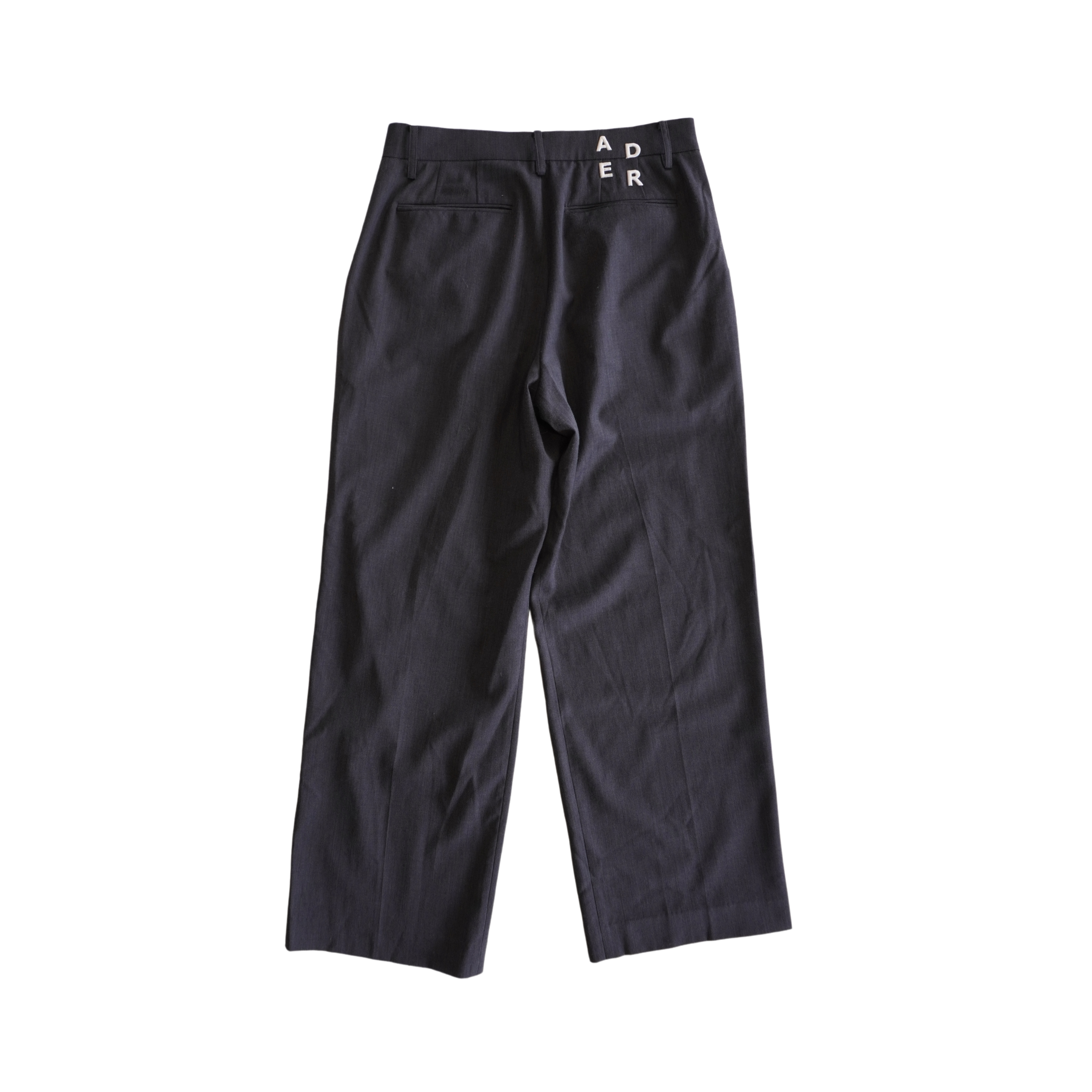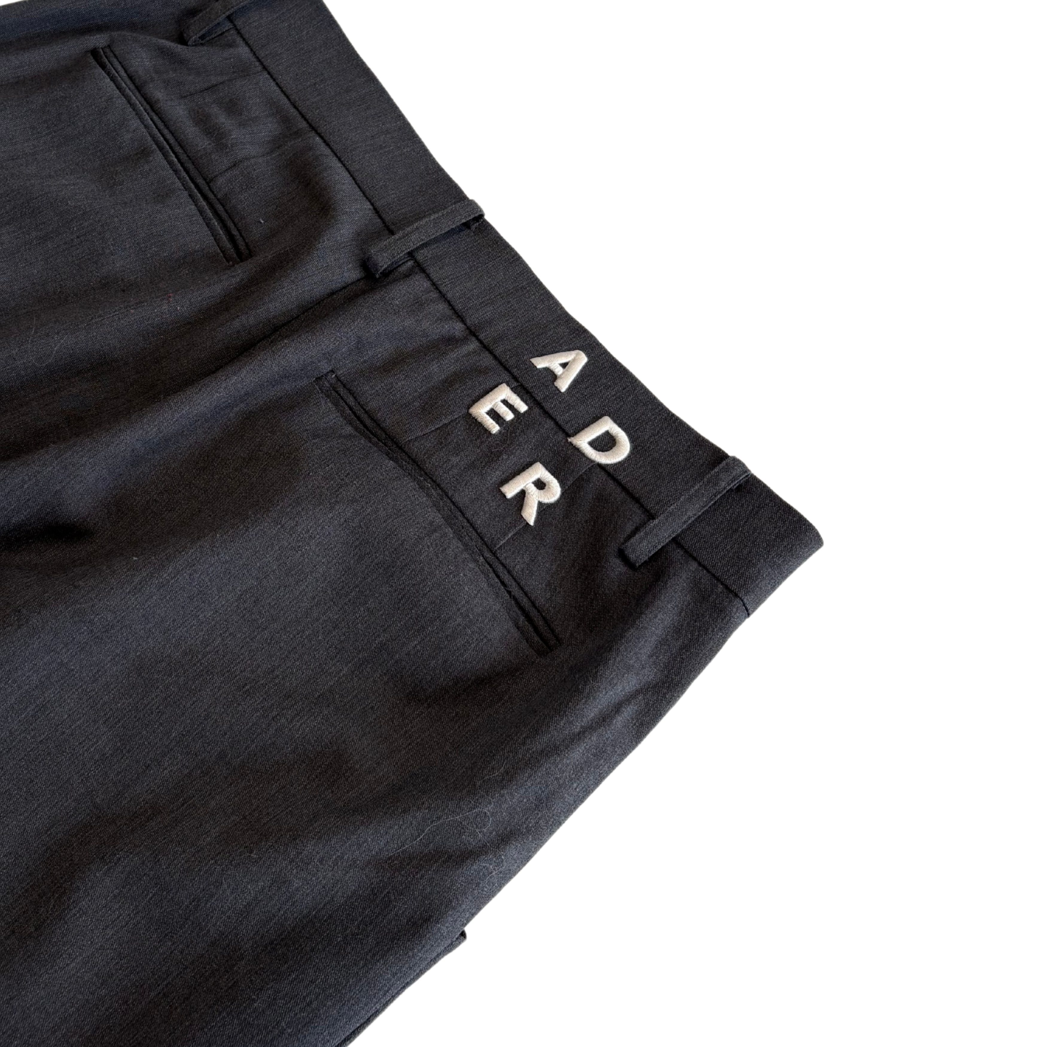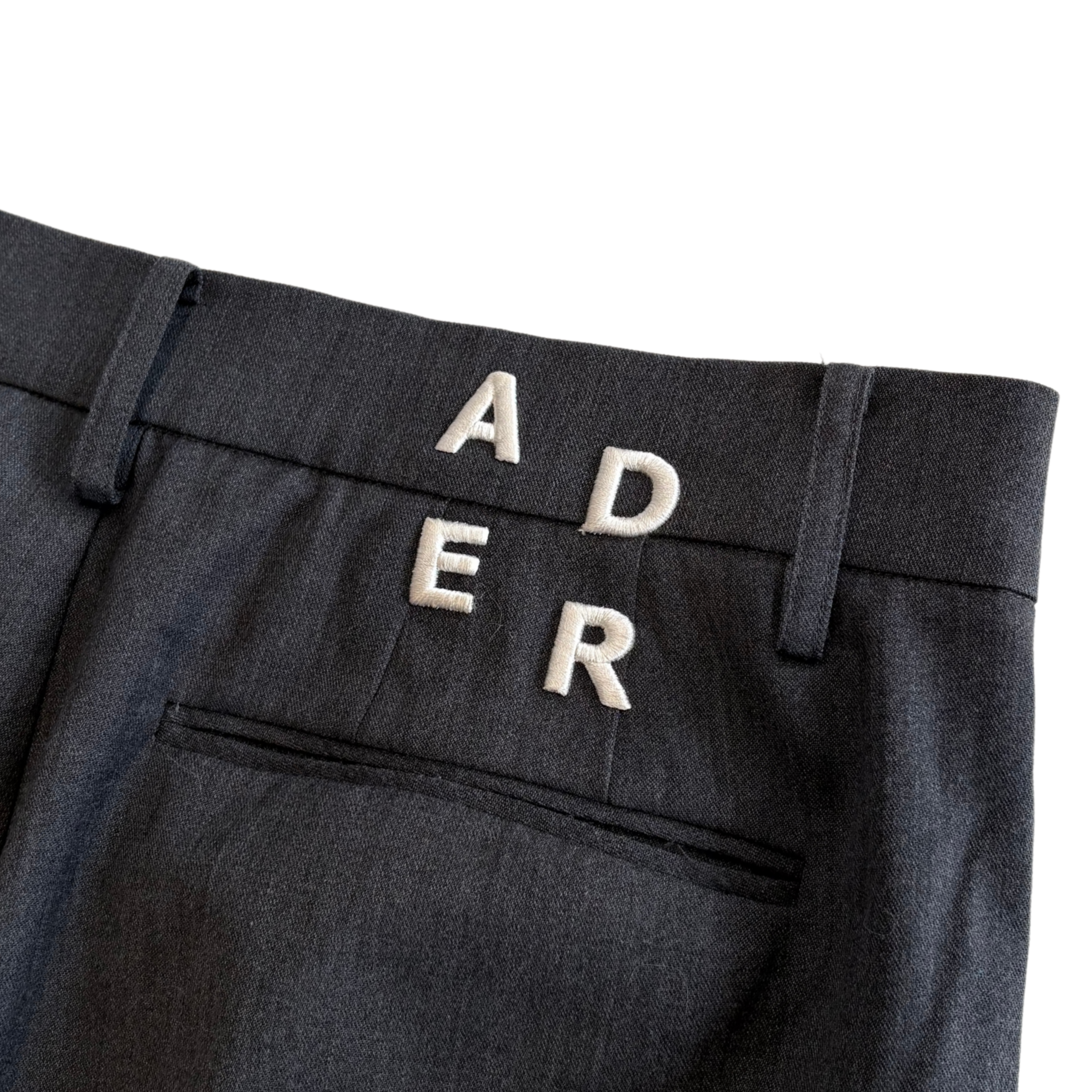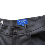 Ader Error mid rise dark grey trousers with front pleats and wide legs. Feature white logo embroidery on the back waistband.