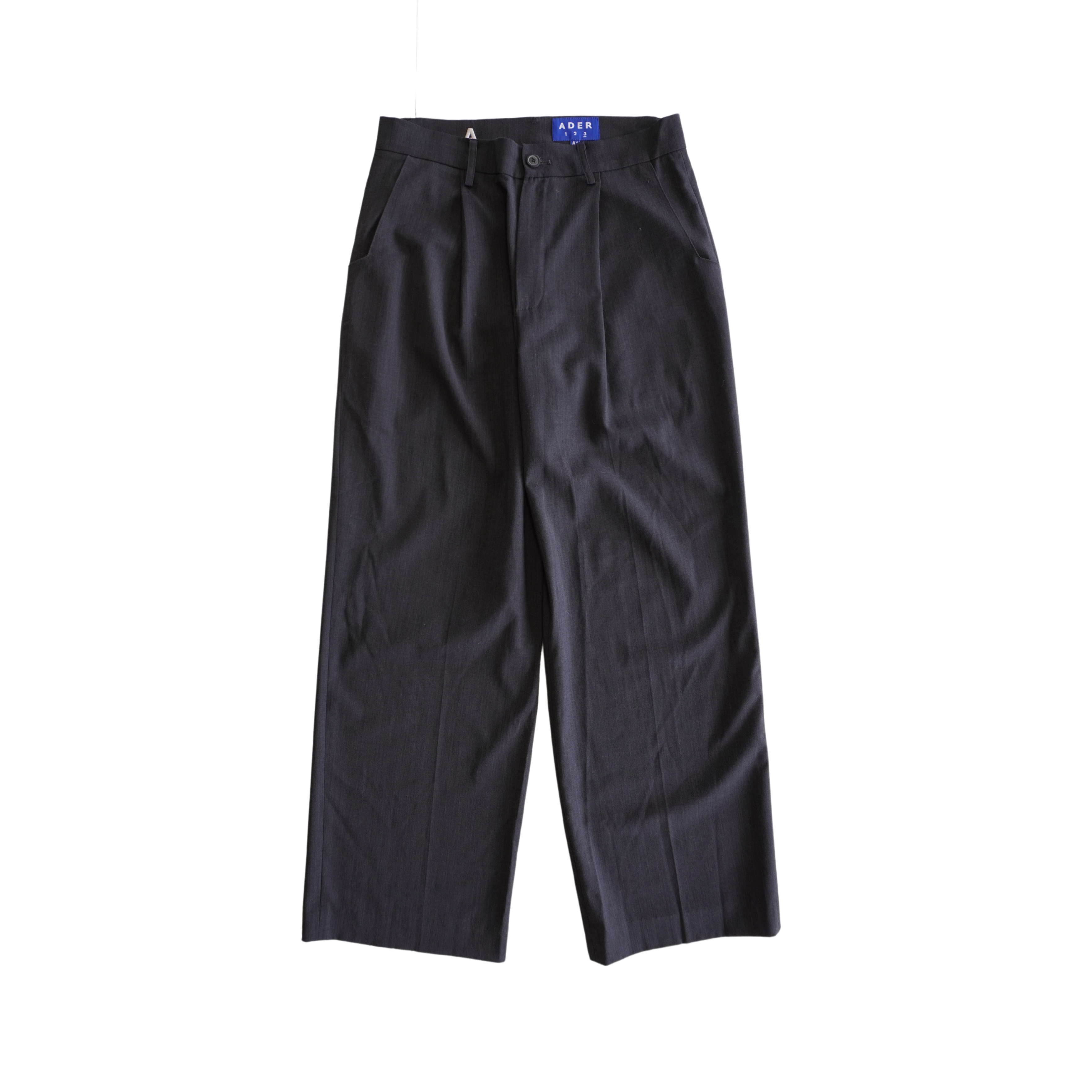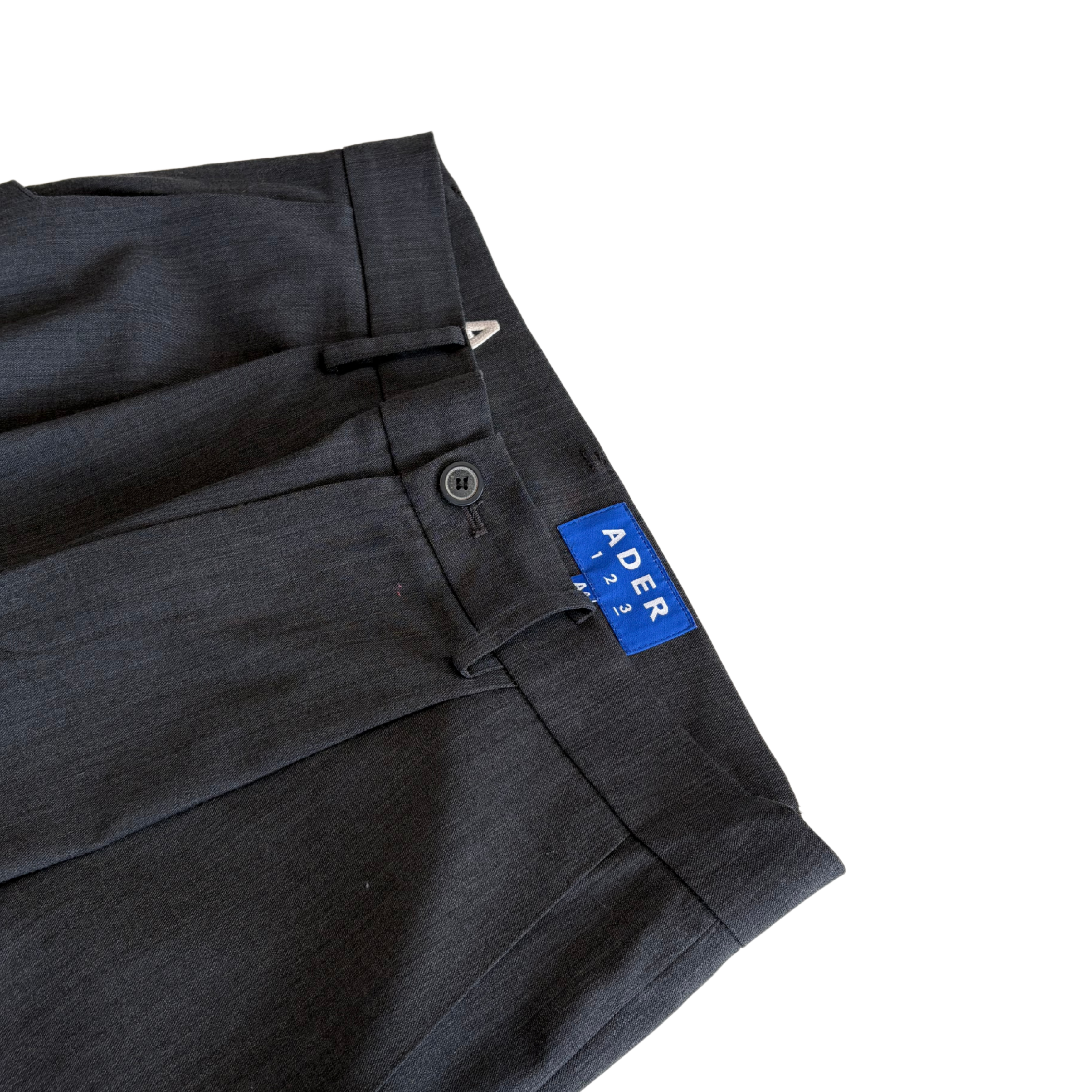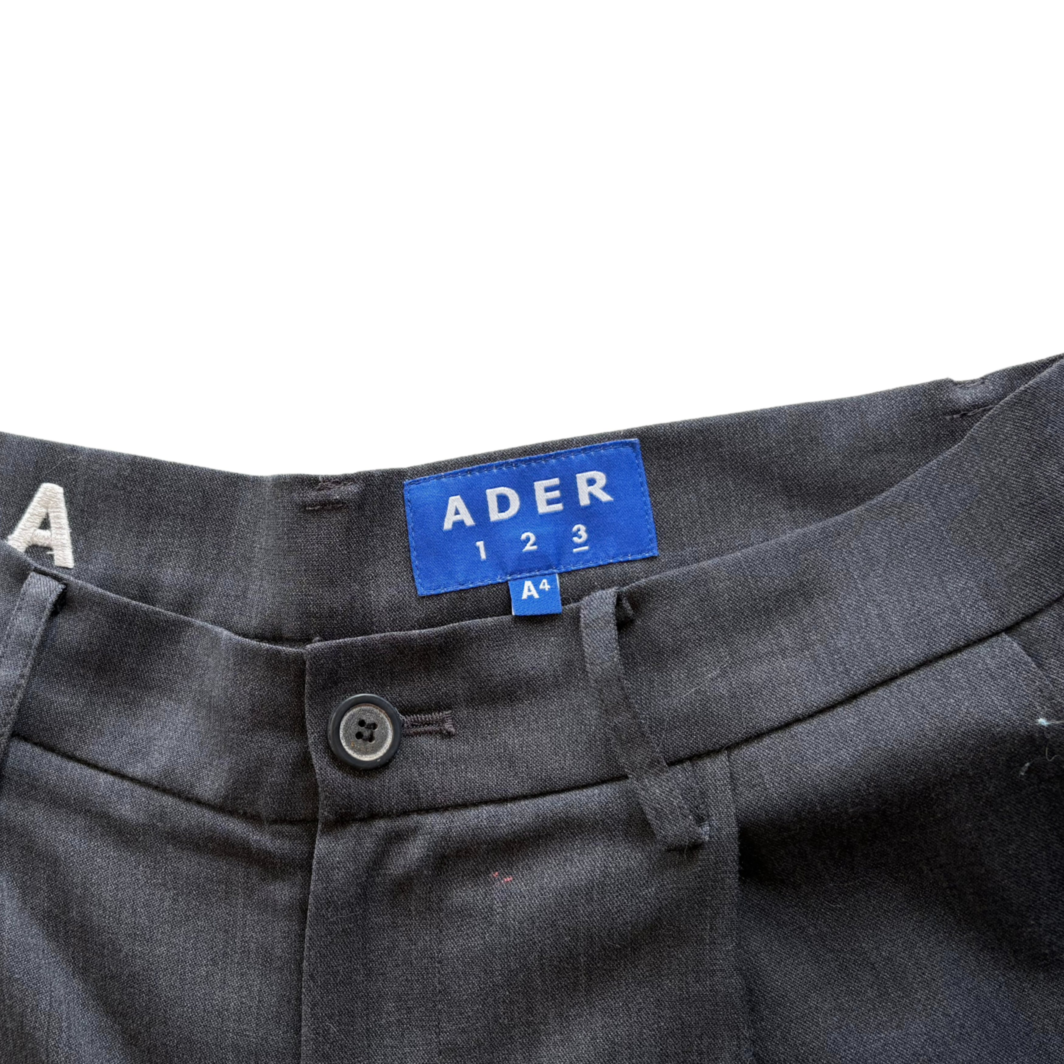 Ader Error mid rise dark grey trousers with front pleats and wide legs. Feature white logo embroidery on the back waistband.