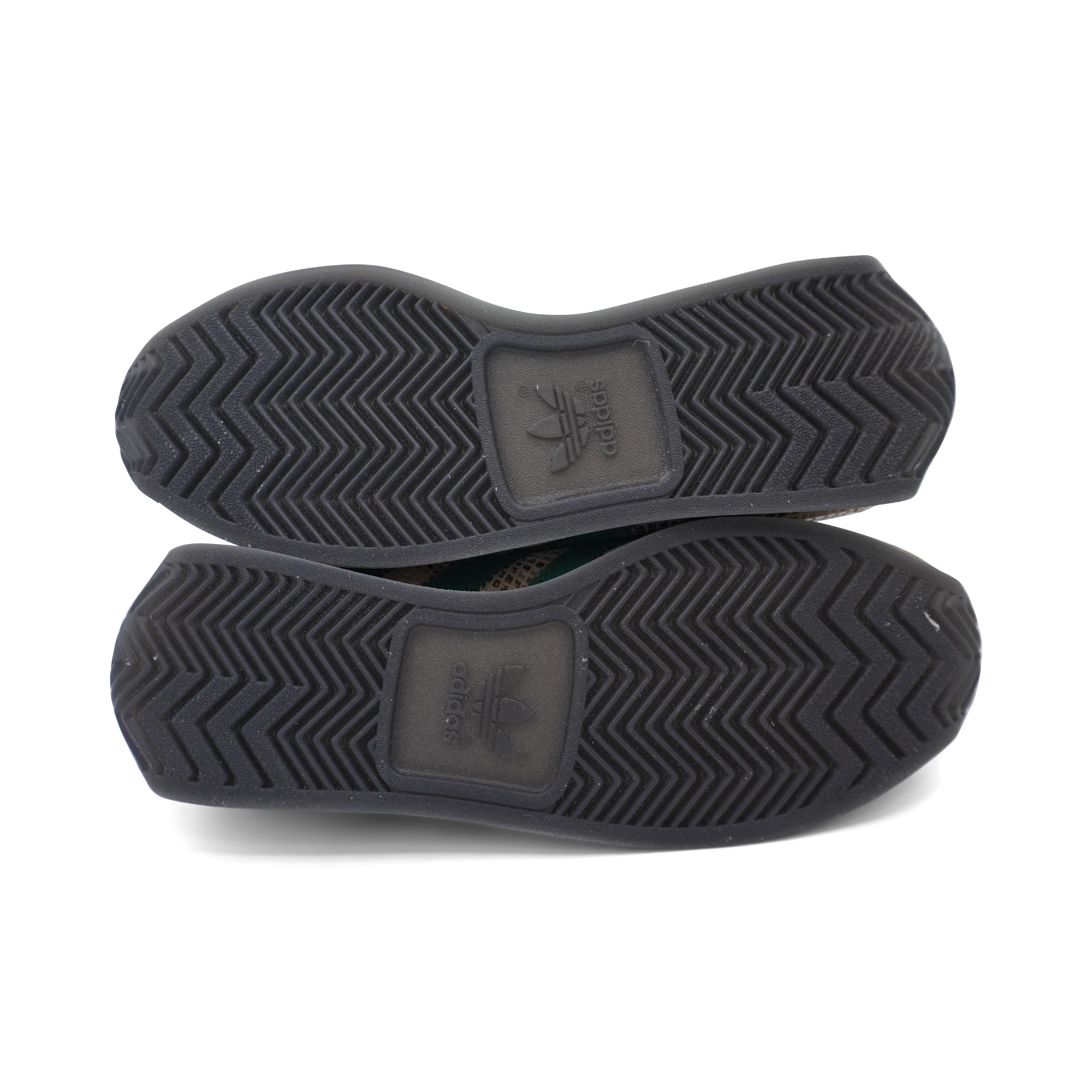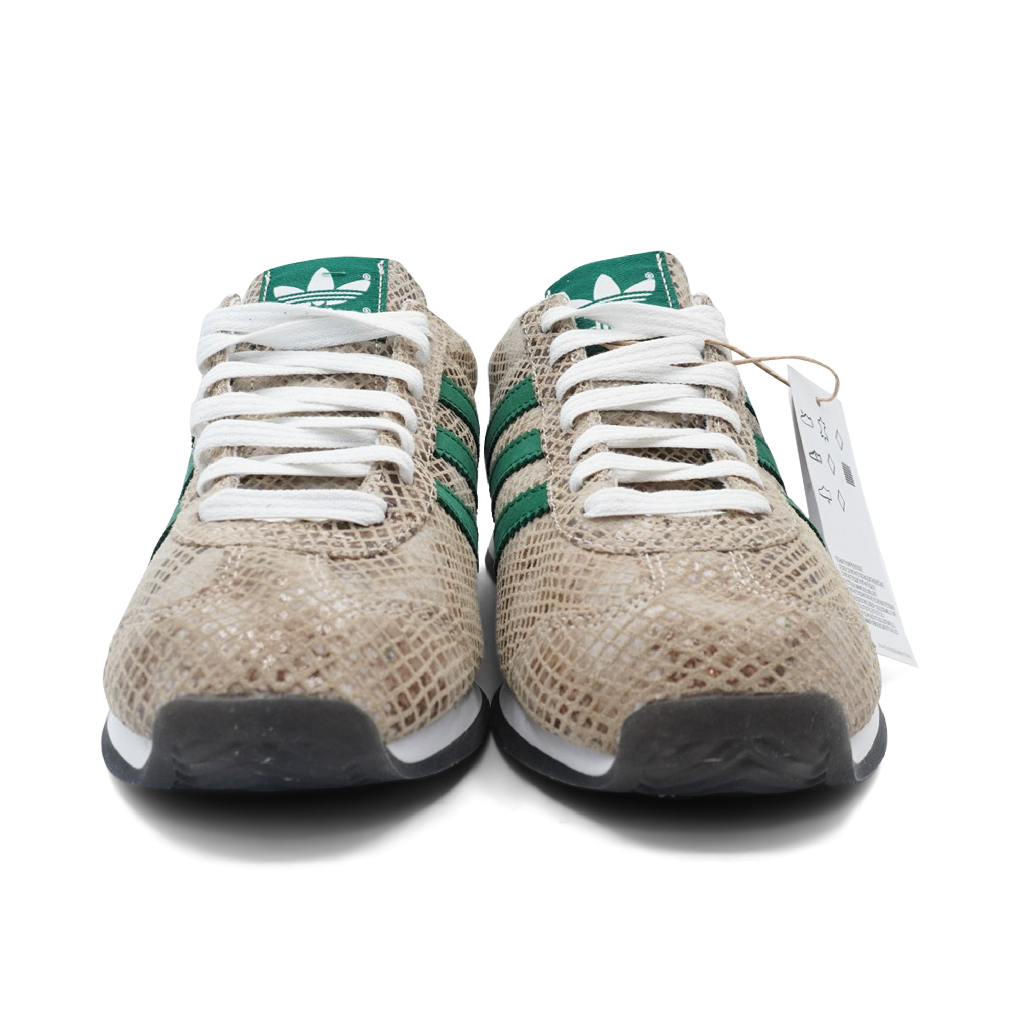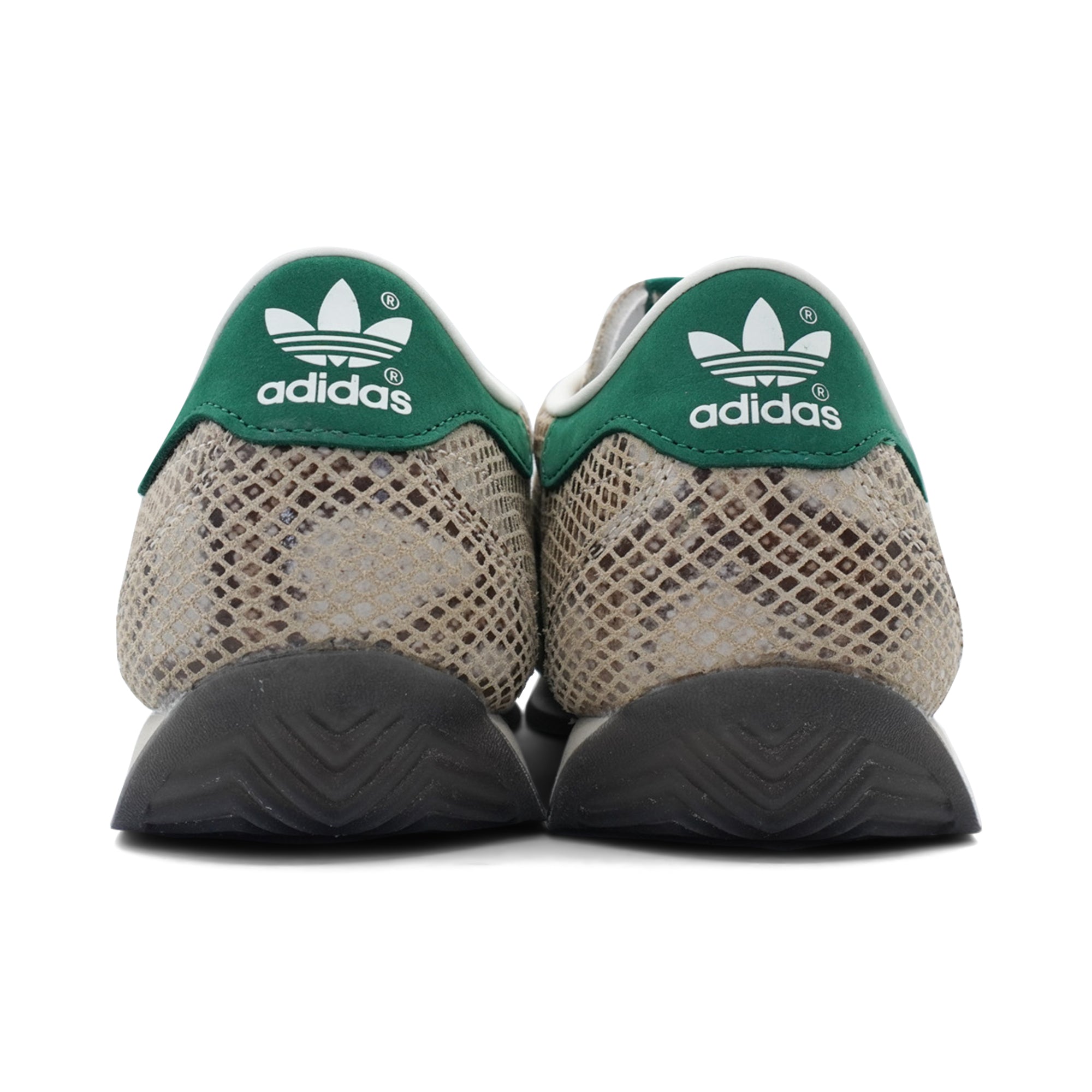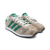 Adidas x Country Japan sneakers in beige and brown snake embossed leather with green suede trim, white laces, and a gold foil logo on the sides.