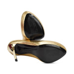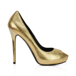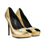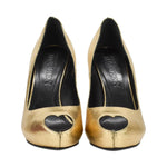 Alexander McQueen platform pumps in metallic gold leather with heart shaped peep-toes and gold metal heels.
