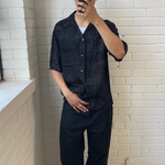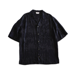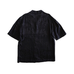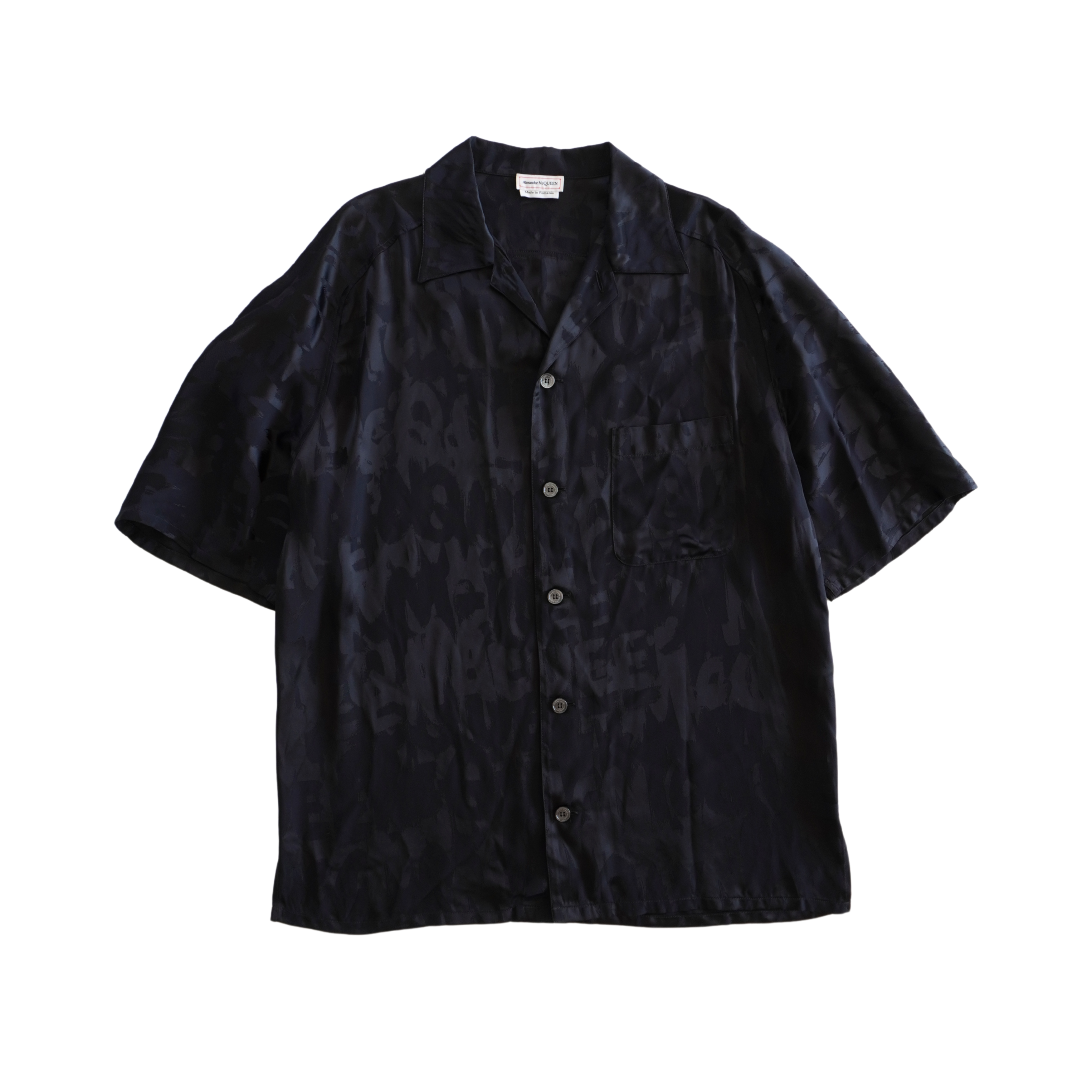 Alexander McQueen camp collar button down shirt in black satin with jacquard graffiti logo and mother of pearl buttons.