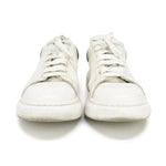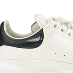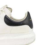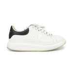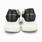 Alexander McQueen chunky sneakers in white leather with a white rubber sole. Features a black heel panel with gold logo, chunky sole, embossed logo on the tongue, and white flat laces.